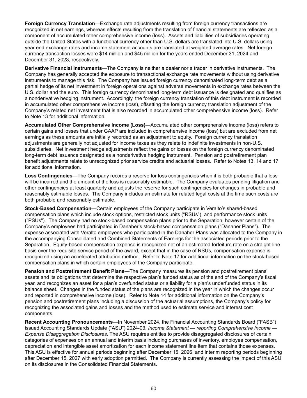 Foreign Currency Translation—Exchange rate adjustments resulting from foreign currency transactions are recognized in net earnings, whereas effects resulting from the translation of financial statements are reflected as a component of accumulated other comprehensive income (loss). Assets and liabilities of subsidiaries operating outside the United States with a functional currency other than U.S. dollars are translated into U.S. dollars using year end exchange rates and income statement accounts are translated at weighted average rates. Net foreign currency transaction losses were $14 million and $45 million for the years ended December 31, 2024 and December 31, 2023, respectively. Derivative Financial Instruments—The Company is neither a dealer nor a trader in derivative instruments. The Company has generally accepted the exposure to transactional exchange rate movements without using derivative instruments to manage this risk. The Company has issued foreign currency denominated long-term debt as a partial hedge of its net investment in foreign operations against adverse movements in exchange rates between the U.S. dollar and the euro. This foreign currency denominated long-term debt issuance is designated and qualifies as a nonderivative hedging instrument. Accordingly, the foreign currency translation of this debt instrument is recorded in accumulated other comprehensive income (loss), offsetting the foreign currency translation adjustment of the Company’s related net investment that is also recorded in accumulated other comprehensive income (loss). Refer to Note 13 for additional information. Accumulated Other Comprehensive Income (Loss)—Accumulated other comprehensive income (loss) refers to certain gains and losses that under GAAP are included in comprehensive income (loss) but are excluded from net earnings as these amounts are initially recorded as an adjustment to equity. Foreign currency translation adjustments are generally not adjusted for income taxes as they relate to indefinite investments in non-U.S. subsidiaries. Net investment hedge adjustments reflect the gains or losses on the foreign currency denominated long-term debt issuance designated as a nonderivative hedging instrument. Pension and postretirement plan benefit adjustments relate to unrecognized prior service credits and actuarial losses. Refer to Notes 13, 14 and 17 for additional information. Loss Contingencies—The Company records a reserve for loss contingencies when it is both probable that a loss will be incurred and the amount of the loss is reasonably estimable. The Company evaluates pending litigation and other contingencies at least quarterly and adjusts the reserve for such contingencies for changes in probable and reasonably estimable losses. The Company includes an estimate for related legal costs at the time such costs are both probable and reasonably estimable. Stock-Based Compensation—Certain employees of the Company participate in Veralto’s shared-based compensation plans which include stock options, restricted stock units (“RSUs”), and performance stock units ("PSUs"). The Company had no stock-based compensation plans prior to the Separation; however certain of the Company’s employees had participated in Danaher’s stock-based compensation plans (“Danaher Plans”). The expense associated with Veralto employees who participated in the Danaher Plans was allocated to the Company in the accompanying Consolidated and Combined Statements of Earnings for the associated periods prior to the Separation. Equity-based compensation expense is recognized net of an estimated forfeiture rate on a straight-line basis over the requisite service period of the award, except that in the case of RSUs, compensation expense is recognized using an accelerated attribution method. Refer to Note 17 for additional information on the stock-based compensation plans in which certain employees of the Company participate. Pension and Postretirement Benefit Plans—The Company measures its pension and postretirement plans’ assets and its obligations that determine the respective plan’s funded status as of the end of the Company’s fiscal year, and recognizes an asset for a plan’s overfunded status or a liability for a plan’s underfunded status in its balance sheet. Changes in the funded status of the plans are recognized in the year in which the changes occur and reported in comprehensive income (loss). Refer to Note 14 for additional information on the Company’s pension and postretirement plans including a discussion of the actuarial assumptions, the Company’s policy for recognizing the associated gains and losses and the method used to estimate service and interest cost components. Recent Accounting Pronouncements—In November 2024, the Financial Accounting Standards Board (“FASB”) issued Accounting Standards Update (“ASU”) 2024-03, Income Statement — reporting Comprehensive Income — Expense Disaggregation Disclosures. The ASU requires entities to provide disaggregated disclosures of certain categories of expenses on an annual and interim basis including purchases of inventory, employee compensation, depreciation and intangible asset amortization for each income statement line item that contains those expenses. This ASU is effective for annual periods beginning after December 15, 2026, and interim reporting periods beginning after December 15, 2027 with early adoption permitted. The Company is currently assessing the impact of this ASU on its disclosures in the Consolidated Financial Statements. 60