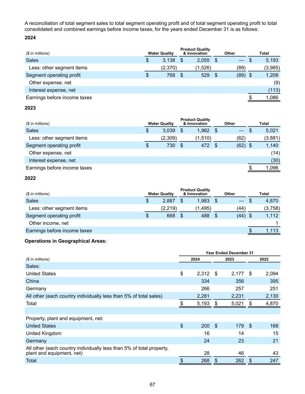 A reconciliation of total segment sales to total segment operating profit and of total segment operating profit to total consolidated and combined earnings before income taxes, for the years ended December 31 is as follows: 2024 ($ in millions) Water Quality Product Quality & Innovation Other Total Sales $ 3,138 $ 2,055 $ — $ 5,193 Less: other segment items (2,370) (1,526) (89) (3,985) Segment operating profit $ 768 $ 529 $ (89) $ 1,208 Other expense, net (9) Interest expense, net (113) Earnings before income taxes $ 1,086 2023 ($ in millions) Water Quality Product Quality & Innovation Other Total Sales $ 3,039 $ 1,982 $ — $ 5,021 Less: other segment items (2,309) (1,510) (62) (3,881) Segment operating profit $ 730 $ 472 $ (62) $ 1,140 Other expense, net (14) Interest expense, net (30) Earnings before income taxes $ 1,096 2022 ($ in millions) Water Quality Product Quality & Innovation Other Total Sales $ 2,887 $ 1,983 $ — $ 4,870 Less: other segment items (2,219) (1,495) (44) (3,758) Segment operating profit $ 668 $ 488 $ (44) $ 1,112 Other income, net 1 Earnings before income taxes $ 1,113 Operations in Geographical Areas: Year Ended December 31 ($ in millions) 2024 2023 2022 Sales: United States $ 2,312 $ 2,177 $ 2,094 China 334 356 395 Germany 266 257 251 All other (each country individually less than 5% of total sales) 2,281 2,231 2,130 Total $ 5,193 $ 5,021 $ 4,870 Property, plant and equipment, net: United States $ 200 $ 179 $ 168 United Kingdom 16 14 15 Germany 24 23 21 All other (each country individually less than 5% of total property, plant and equipment, net) 28 46 43 Total $ 268 $ 262 $ 247 67
