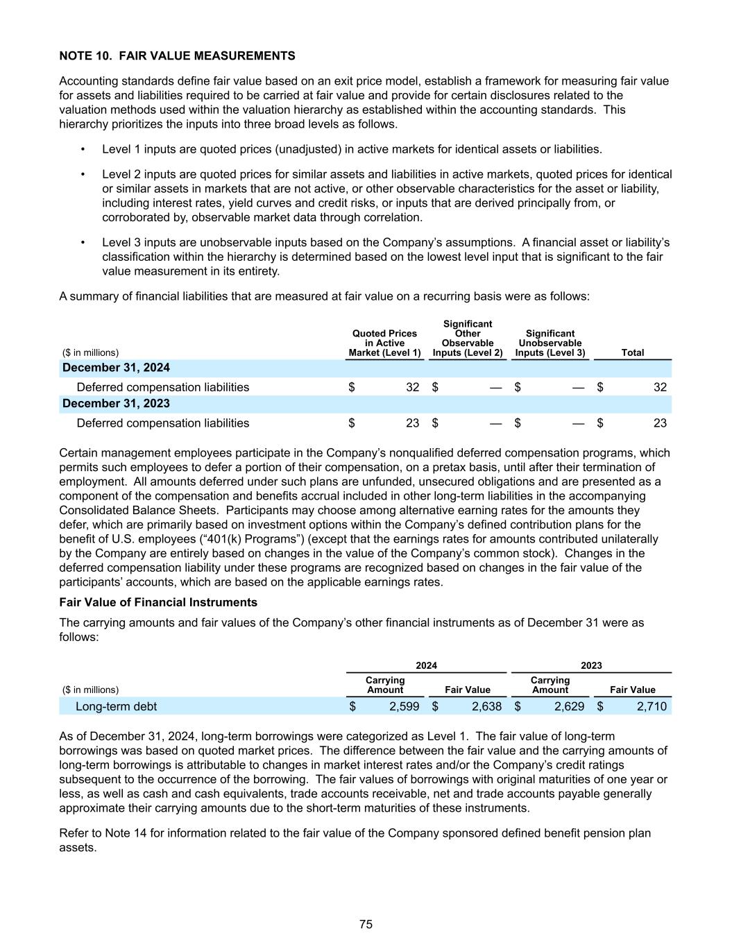 NOTE 10. FAIR VALUE MEASUREMENTS Accounting standards define fair value based on an exit price model, establish a framework for measuring fair value for assets and liabilities required to be carried at fair value and provide for certain disclosures related to the valuation methods used within the valuation hierarchy as established within the accounting standards. This hierarchy prioritizes the inputs into three broad levels as follows. • Level 1 inputs are quoted prices (unadjusted) in active markets for identical assets or liabilities. • Level 2 inputs are quoted prices for similar assets and liabilities in active markets, quoted prices for identical or similar assets in markets that are not active, or other observable characteristics for the asset or liability, including interest rates, yield curves and credit risks, or inputs that are derived principally from, or corroborated by, observable market data through correlation. • Level 3 inputs are unobservable inputs based on the Company’s assumptions. A financial asset or liability’s classification within the hierarchy is determined based on the lowest level input that is significant to the fair value measurement in its entirety. A summary of financial liabilities that are measured at fair value on a recurring basis were as follows: ($ in millions) Quoted Prices in Active Market (Level 1) Significant Other Observable Inputs (Level 2) Significant Unobservable Inputs (Level 3) Total December 31, 2024 Deferred compensation liabilities $ 32 $ — $ — $ 32 December 31, 2023 Deferred compensation liabilities $ 23 $ — $ — $ 23 Certain management employees participate in the Company’s nonqualified deferred compensation programs, which permits such employees to defer a portion of their compensation, on a pretax basis, until after their termination of employment. All amounts deferred under such plans are unfunded, unsecured obligations and are presented as a component of the compensation and benefits accrual included in other long-term liabilities in the accompanying Consolidated Balance Sheets. Participants may choose among alternative earning rates for the amounts they defer, which are primarily based on investment options within the Company’s defined contribution plans for the benefit of U.S. employees (“401(k) Programs”) (except that the earnings rates for amounts contributed unilaterally by the Company are entirely based on changes in the value of the Company’s common stock). Changes in the deferred compensation liability under these programs are recognized based on changes in the fair value of the participants’ accounts, which are based on the applicable earnings rates. Fair Value of Financial Instruments The carrying amounts and fair values of the Company’s other financial instruments as of December 31 were as follows: 2024 2023 ($ in millions) Carrying Amount Fair Value Carrying Amount Fair Value Long-term debt $ 2,599 $ 2,638 $ 2,629 $ 2,710 As of December 31, 2024, long-term borrowings were categorized as Level 1. The fair value of long-term borrowings was based on quoted market prices. The difference between the fair value and the carrying amounts of long-term borrowings is attributable to changes in market interest rates and/or the Company’s credit ratings subsequent to the occurrence of the borrowing. The fair values of borrowings with original maturities of one year or less, as well as cash and cash equivalents, trade accounts receivable, net and trade accounts payable generally approximate their carrying amounts due to the short-term maturities of these instruments. Refer to Note 14 for information related to the fair value of the Company sponsored defined benefit pension plan assets. 75