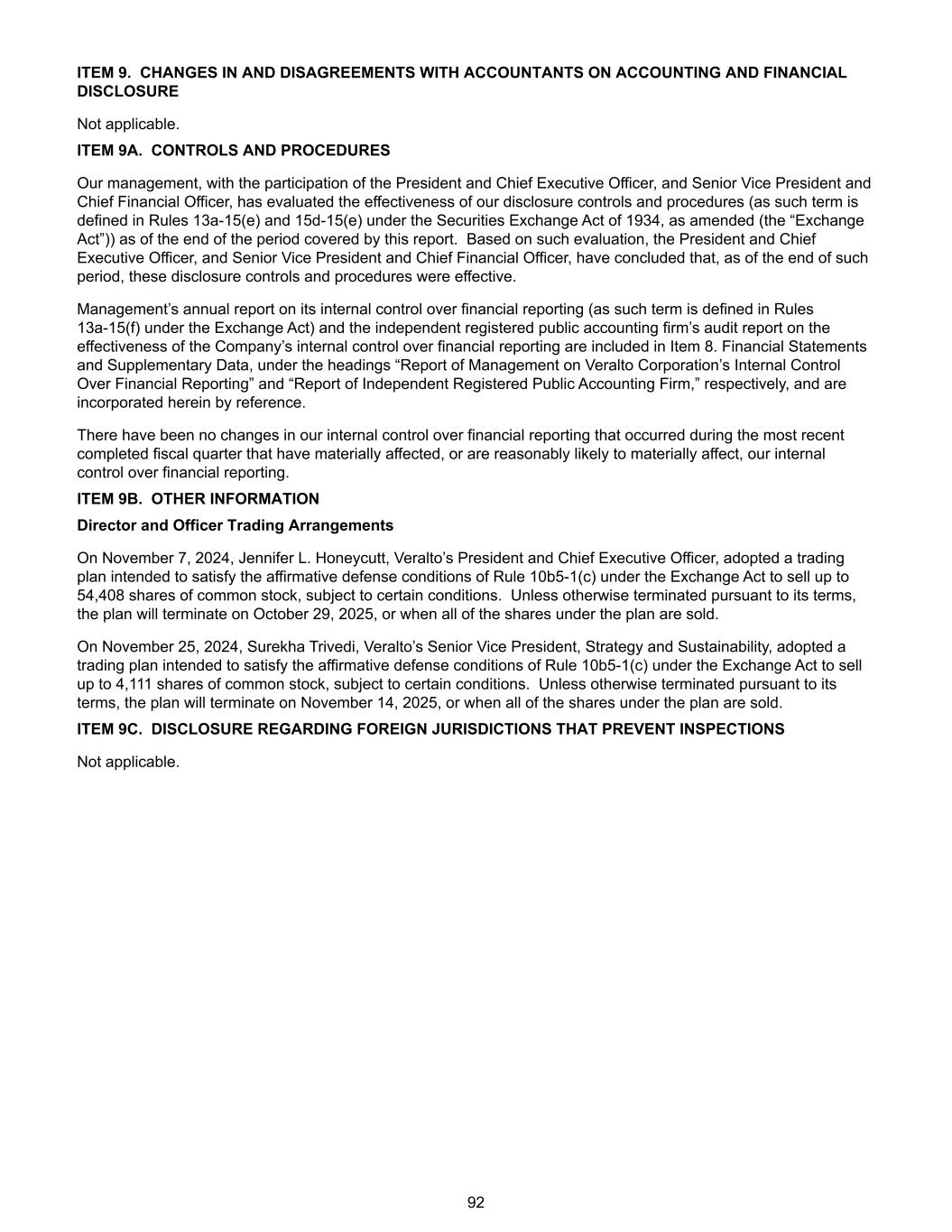 ITEM 9. CHANGES IN AND DISAGREEMENTS WITH ACCOUNTANTS ON ACCOUNTING AND FINANCIAL DISCLOSURE Not applicable. ITEM 9A. CONTROLS AND PROCEDURES Our management, with the participation of the President and Chief Executive Officer, and Senior Vice President and Chief Financial Officer, has evaluated the effectiveness of our disclosure controls and procedures (as such term is defined in Rules 13a-15(e) and 15d-15(e) under the Securities Exchange Act of 1934, as amended (the “Exchange Act”)) as of the end of the period covered by this report. Based on such evaluation, the President and Chief Executive Officer, and Senior Vice President and Chief Financial Officer, have concluded that, as of the end of such period, these disclosure controls and procedures were effective. Management’s annual report on its internal control over financial reporting (as such term is defined in Rules 13a-15(f) under the Exchange Act) and the independent registered public accounting firm’s audit report on the effectiveness of the Company’s internal control over financial reporting are included in Item 8. Financial Statements and Supplementary Data, under the headings “Report of Management on Veralto Corporation’s Internal Control Over Financial Reporting” and “Report of Independent Registered Public Accounting Firm,” respectively, and are incorporated herein by reference. There have been no changes in our internal control over financial reporting that occurred during the most recent completed fiscal quarter that have materially affected, or are reasonably likely to materially affect, our internal control over financial reporting. ITEM 9B. OTHER INFORMATION Director and Officer Trading Arrangements On November 7, 2024, Jennifer L. Honeycutt, Veralto’s President and Chief Executive Officer, adopted a trading plan intended to satisfy the affirmative defense conditions of Rule 10b5-1(c) under the Exchange Act to sell up to 54,408 shares of common stock, subject to certain conditions. Unless otherwise terminated pursuant to its terms, the plan will terminate on October 29, 2025, or when all of the shares under the plan are sold. On November 25, 2024, Surekha Trivedi, Veralto’s Senior Vice President, Strategy and Sustainability, adopted a trading plan intended to satisfy the affirmative defense conditions of Rule 10b5-1(c) under the Exchange Act to sell up to 4,111 shares of common stock, subject to certain conditions. Unless otherwise terminated pursuant to its terms, the plan will terminate on November 14, 2025, or when all of the shares under the plan are sold. ITEM 9C. DISCLOSURE REGARDING FOREIGN JURISDICTIONS THAT PREVENT INSPECTIONS Not applicable. 92