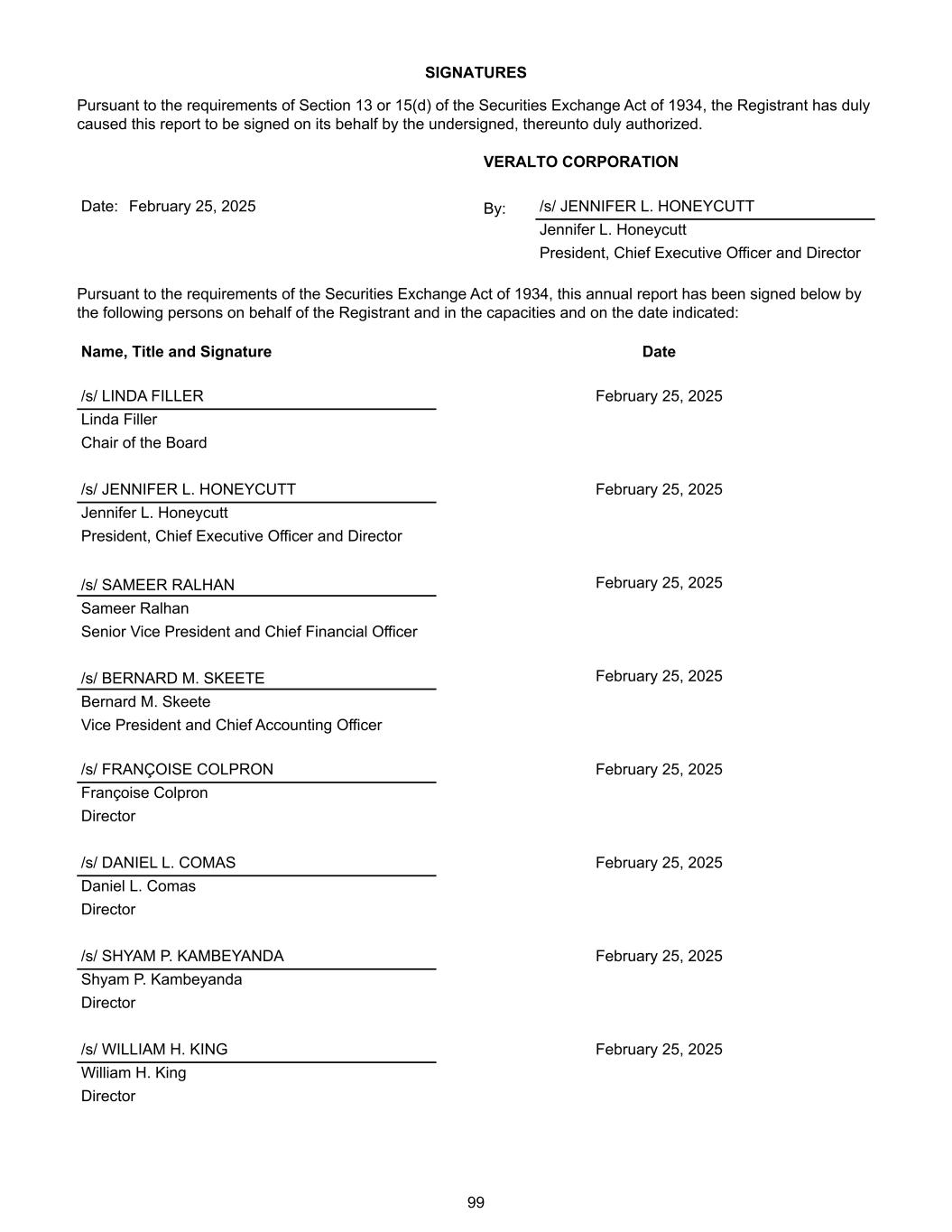 SIGNATURES Pursuant to the requirements of Section 13 or 15(d) of the Securities Exchange Act of 1934, the Registrant has duly caused this report to be signed on its behalf by the undersigned, thereunto duly authorized. VERALTO CORPORATION Date: February 25, 2025 By: /s/ JENNIFER L. HONEYCUTT Jennifer L. Honeycutt President, Chief Executive Officer and Director Pursuant to the requirements of the Securities Exchange Act of 1934, this annual report has been signed below by the following persons on behalf of the Registrant and in the capacities and on the date indicated: Name, Title and Signature Date /s/ LINDA FILLER February 25, 2025 Linda Filler Chair of the Board /s/ JENNIFER L. HONEYCUTT February 25, 2025 Jennifer L. Honeycutt President, Chief Executive Officer and Director /s/ SAMEER RALHAN February 25, 2025 Sameer Ralhan Senior Vice President and Chief Financial Officer /s/ BERNARD M. SKEETE February 25, 2025 Bernard M. Skeete Vice President and Chief Accounting Officer /s/ FRANÇOISE COLPRON February 25, 2025 Françoise Colpron Director /s/ DANIEL L. COMAS February 25, 2025 Daniel L. Comas Director /s/ SHYAM P. KAMBEYANDA February 25, 2025 Shyam P. Kambeyanda Director /s/ WILLIAM H. KING February 25, 2025 William H. King Director 99