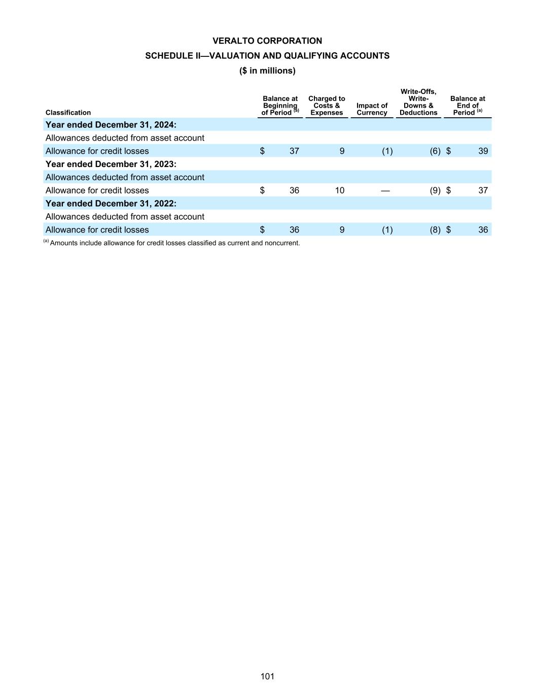 VERALTO CORPORATION SCHEDULE II—VALUATION AND QUALIFYING ACCOUNTS ($ in millions) Classification Balance at Beginning of Period (a) Charged to Costs & Expenses Impact of Currency Write-Offs, Write- Downs & Deductions Balance at End of Period (a) Year ended December 31, 2024: Allowances deducted from asset account Allowance for credit losses $ 37 9 (1) (6) $ 39 Year ended December 31, 2023: Allowances deducted from asset account Allowance for credit losses $ 36 10 — (9) $ 37 Year ended December 31, 2022: Allowances deducted from asset account Allowance for credit losses $ 36 9 (1) (8) $ 36 (a) Amounts include allowance for credit losses classified as current and noncurrent. 101