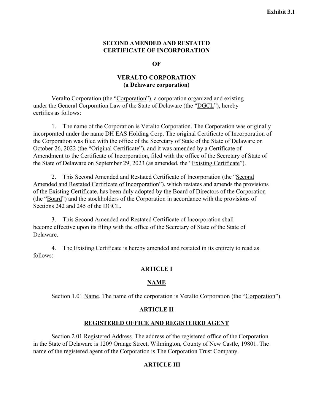 SECOND AMENDED AND RESTATED CERTIFICATE OF INCORPORATION OF VERALTO CORPORATION (a Delaware corporation) Veralto Corporation (the “Corporation”), a corporation organized and existing under the General Corporation Law of the State of Delaware (the “DGCL”), hereby certifies as follows: 1. The name of the Corporation is Veralto Corporation. The Corporation was originally incorporated under the name DH EAS Holding Corp. The original Certificate of Incorporation of the Corporation was filed with the office of the Secretary of State of the State of Delaware on October 26, 2022 (the “Original Certificate”), and it was amended by a Certificate of Amendment to the Certificate of Incorporation, filed with the office of the Secretary of State of the State of Delaware on September 29, 2023 (as amended, the “Existing Certificate”). 2. This Second Amended and Restated Certificate of Incorporation (the “Second Amended and Restated Certificate of Incorporation”), which restates and amends the provisions of the Existing Certificate, has been duly adopted by the Board of Directors of the Corporation (the “Board”) and the stockholders of the Corporation in accordance with the provisions of Sections 242 and 245 of the DGCL. 3. This Second Amended and Restated Certificate of Incorporation shall become effective upon its filing with the office of the Secretary of State of the State of Delaware. 4. The Existing Certificate is hereby amended and restated in its entirety to read as follows: ARTICLE I NAME Section 1.01 Name. The name of the corporation is Veralto Corporation (the “Corporation”). ARTICLE II REGISTERED OFFICE AND REGISTERED AGENT Section 2.01 Registered Address. The address of the registered office of the Corporation in the State of Delaware is 1209 Orange Street, Wilmington, County of New Castle, 19801. The name of the registered agent of the Corporation is The Corporation Trust Company. ARTICLE III Exhibit 3.1
