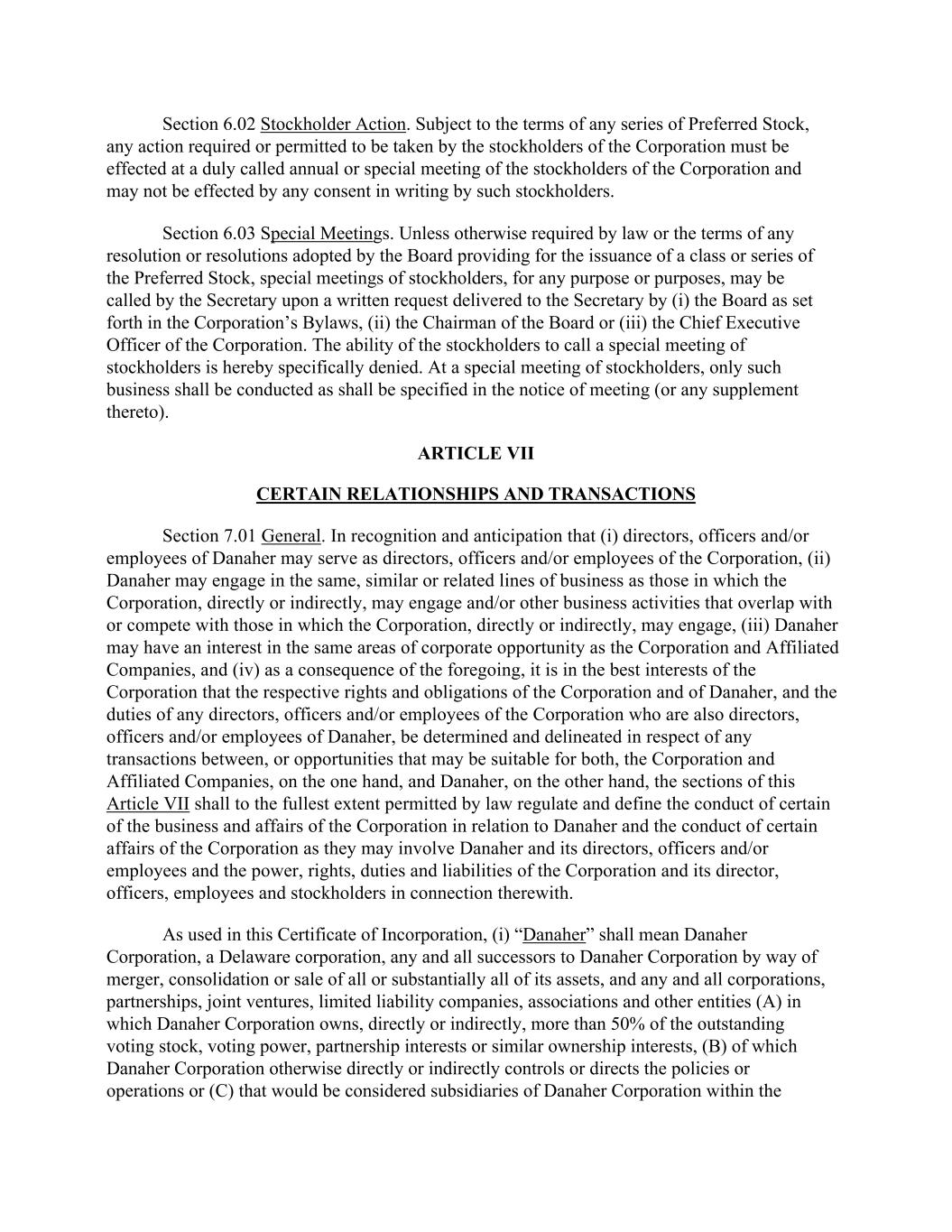 Section 6.02 Stockholder Action. Subject to the terms of any series of Preferred Stock, any action required or permitted to be taken by the stockholders of the Corporation must be effected at a duly called annual or special meeting of the stockholders of the Corporation and may not be effected by any consent in writing by such stockholders. Section 6.03 Special Meetings. Unless otherwise required by law or the terms of any resolution or resolutions adopted by the Board providing for the issuance of a class or series of the Preferred Stock, special meetings of stockholders, for any purpose or purposes, may be called by the Secretary upon a written request delivered to the Secretary by (i) the Board as set forth in the Corporation’s Bylaws, (ii) the Chairman of the Board or (iii) the Chief Executive Officer of the Corporation. The ability of the stockholders to call a special meeting of stockholders is hereby specifically denied. At a special meeting of stockholders, only such business shall be conducted as shall be specified in the notice of meeting (or any supplement thereto). ARTICLE VII CERTAIN RELATIONSHIPS AND TRANSACTIONS Section 7.01 General. In recognition and anticipation that (i) directors, officers and/or employees of Danaher may serve as directors, officers and/or employees of the Corporation, (ii) Danaher may engage in the same, similar or related lines of business as those in which the Corporation, directly or indirectly, may engage and/or other business activities that overlap with or compete with those in which the Corporation, directly or indirectly, may engage, (iii) Danaher may have an interest in the same areas of corporate opportunity as the Corporation and Affiliated Companies, and (iv) as a consequence of the foregoing, it is in the best interests of the Corporation that the respective rights and obligations of the Corporation and of Danaher, and the duties of any directors, officers and/or employees of the Corporation who are also directors, officers and/or employees of Danaher, be determined and delineated in respect of any transactions between, or opportunities that may be suitable for both, the Corporation and Affiliated Companies, on the one hand, and Danaher, on the other hand, the sections of this Article VII shall to the fullest extent permitted by law regulate and define the conduct of certain of the business and affairs of the Corporation in relation to Danaher and the conduct of certain affairs of the Corporation as they may involve Danaher and its directors, officers and/or employees and the power, rights, duties and liabilities of the Corporation and its director, officers, employees and stockholders in connection therewith. As used in this Certificate of Incorporation, (i) “Danaher” shall mean Danaher Corporation, a Delaware corporation, any and all successors to Danaher Corporation by way of merger, consolidation or sale of all or substantially all of its assets, and any and all corporations, partnerships, joint ventures, limited liability companies, associations and other entities (A) in which Danaher Corporation owns, directly or indirectly, more than 50% of the outstanding voting stock, voting power, partnership interests or similar ownership interests, (B) of which Danaher Corporation otherwise directly or indirectly controls or directs the policies or operations or (C) that would be considered subsidiaries of Danaher Corporation within the