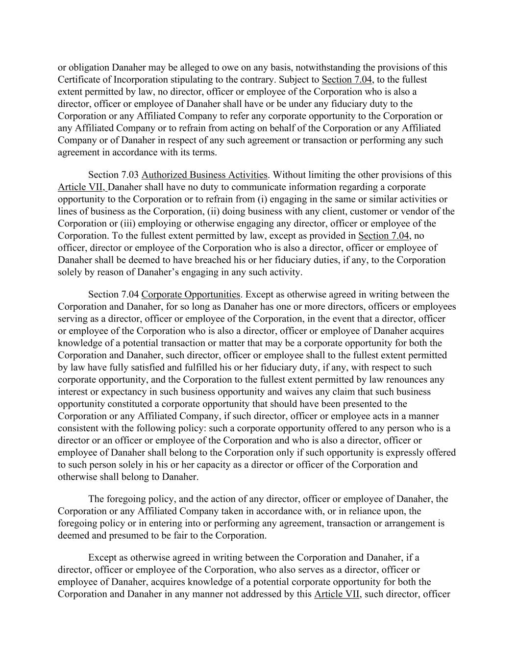 or obligation Danaher may be alleged to owe on any basis, notwithstanding the provisions of this Certificate of Incorporation stipulating to the contrary. Subject to Section 7.04, to the fullest extent permitted by law, no director, officer or employee of the Corporation who is also a director, officer or employee of Danaher shall have or be under any fiduciary duty to the Corporation or any Affiliated Company to refer any corporate opportunity to the Corporation or any Affiliated Company or to refrain from acting on behalf of the Corporation or any Affiliated Company or of Danaher in respect of any such agreement or transaction or performing any such agreement in accordance with its terms. Section 7.03 Authorized Business Activities. Without limiting the other provisions of this Article VII, Danaher shall have no duty to communicate information regarding a corporate opportunity to the Corporation or to refrain from (i) engaging in the same or similar activities or lines of business as the Corporation, (ii) doing business with any client, customer or vendor of the Corporation or (iii) employing or otherwise engaging any director, officer or employee of the Corporation. To the fullest extent permitted by law, except as provided in Section 7.04, no officer, director or employee of the Corporation who is also a director, officer or employee of Danaher shall be deemed to have breached his or her fiduciary duties, if any, to the Corporation solely by reason of Danaher’s engaging in any such activity. Section 7.04 Corporate Opportunities. Except as otherwise agreed in writing between the Corporation and Danaher, for so long as Danaher has one or more directors, officers or employees serving as a director, officer or employee of the Corporation, in the event that a director, officer or employee of the Corporation who is also a director, officer or employee of Danaher acquires knowledge of a potential transaction or matter that may be a corporate opportunity for both the Corporation and Danaher, such director, officer or employee shall to the fullest extent permitted by law have fully satisfied and fulfilled his or her fiduciary duty, if any, with respect to such corporate opportunity, and the Corporation to the fullest extent permitted by law renounces any interest or expectancy in such business opportunity and waives any claim that such business opportunity constituted a corporate opportunity that should have been presented to the Corporation or any Affiliated Company, if such director, officer or employee acts in a manner consistent with the following policy: such a corporate opportunity offered to any person who is a director or an officer or employee of the Corporation and who is also a director, officer or employee of Danaher shall belong to the Corporation only if such opportunity is expressly offered to such person solely in his or her capacity as a director or officer of the Corporation and otherwise shall belong to Danaher. The foregoing policy, and the action of any director, officer or employee of Danaher, the Corporation or any Affiliated Company taken in accordance with, or in reliance upon, the foregoing policy or in entering into or performing any agreement, transaction or arrangement is deemed and presumed to be fair to the Corporation. Except as otherwise agreed in writing between the Corporation and Danaher, if a director, officer or employee of the Corporation, who also serves as a director, officer or employee of Danaher, acquires knowledge of a potential corporate opportunity for both the Corporation and Danaher in any manner not addressed by this Article VII, such director, officer