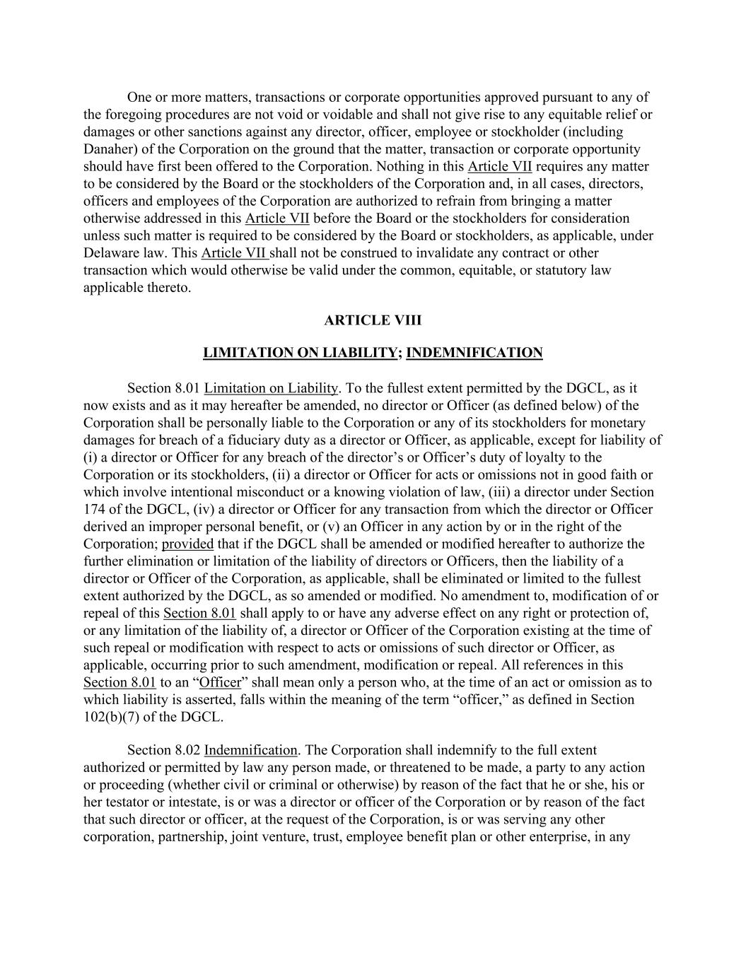 One or more matters, transactions or corporate opportunities approved pursuant to any of the foregoing procedures are not void or voidable and shall not give rise to any equitable relief or damages or other sanctions against any director, officer, employee or stockholder (including Danaher) of the Corporation on the ground that the matter, transaction or corporate opportunity should have first been offered to the Corporation. Nothing in this Article VII requires any matter to be considered by the Board or the stockholders of the Corporation and, in all cases, directors, officers and employees of the Corporation are authorized to refrain from bringing a matter otherwise addressed in this Article VII before the Board or the stockholders for consideration unless such matter is required to be considered by the Board or stockholders, as applicable, under Delaware law. This Article VII shall not be construed to invalidate any contract or other transaction which would otherwise be valid under the common, equitable, or statutory law applicable thereto. ARTICLE VIII LIMITATION ON LIABILITY; INDEMNIFICATION Section 8.01 Limitation on Liability. To the fullest extent permitted by the DGCL, as it now exists and as it may hereafter be amended, no director or Officer (as defined below) of the Corporation shall be personally liable to the Corporation or any of its stockholders for monetary damages for breach of a fiduciary duty as a director or Officer, as applicable, except for liability of (i) a director or Officer for any breach of the director’s or Officer’s duty of loyalty to the Corporation or its stockholders, (ii) a director or Officer for acts or omissions not in good faith or which involve intentional misconduct or a knowing violation of law, (iii) a director under Section 174 of the DGCL, (iv) a director or Officer for any transaction from which the director or Officer derived an improper personal benefit, or (v) an Officer in any action by or in the right of the Corporation; provided that if the DGCL shall be amended or modified hereafter to authorize the further elimination or limitation of the liability of directors or Officers, then the liability of a director or Officer of the Corporation, as applicable, shall be eliminated or limited to the fullest extent authorized by the DGCL, as so amended or modified. No amendment to, modification of or repeal of this Section 8.01 shall apply to or have any adverse effect on any right or protection of, or any limitation of the liability of, a director or Officer of the Corporation existing at the time of such repeal or modification with respect to acts or omissions of such director or Officer, as applicable, occurring prior to such amendment, modification or repeal. All references in this Section 8.01 to an “Officer” shall mean only a person who, at the time of an act or omission as to which liability is asserted, falls within the meaning of the term “officer,” as defined in Section 102(b)(7) of the DGCL. Section 8.02 Indemnification. The Corporation shall indemnify to the full extent authorized or permitted by law any person made, or threatened to be made, a party to any action or proceeding (whether civil or criminal or otherwise) by reason of the fact that he or she, his or her testator or intestate, is or was a director or officer of the Corporation or by reason of the fact that such director or officer, at the request of the Corporation, is or was serving any other corporation, partnership, joint venture, trust, employee benefit plan or other enterprise, in any