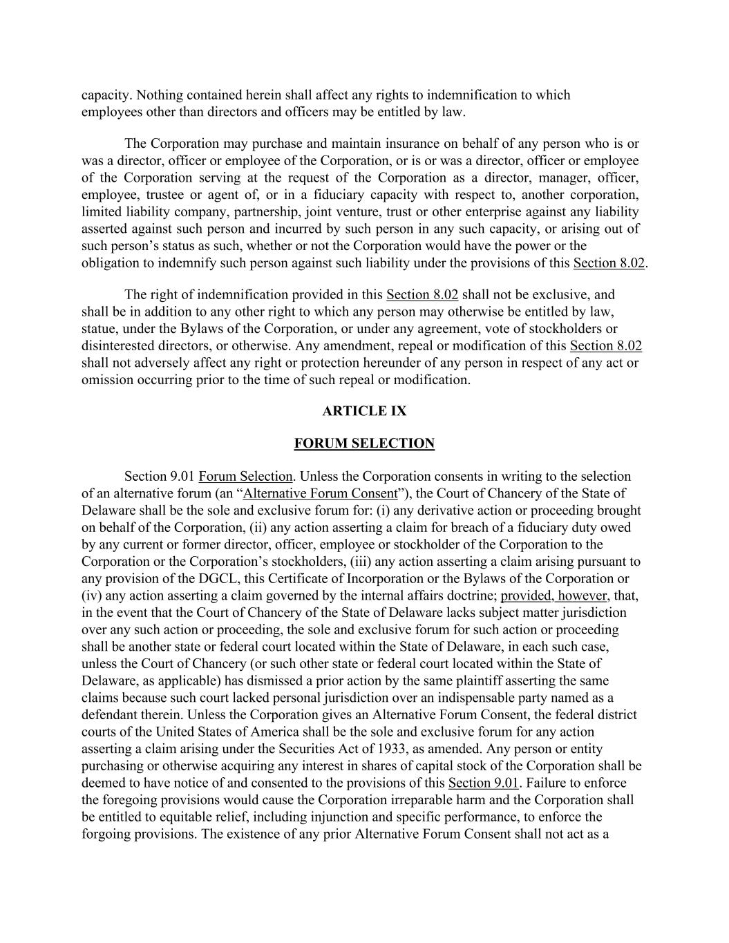 capacity. Nothing contained herein shall affect any rights to indemnification to which employees other than directors and officers may be entitled by law. The Corporation may purchase and maintain insurance on behalf of any person who is or was a director, officer or employee of the Corporation, or is or was a director, officer or employee of the Corporation serving at the request of the Corporation as a director, manager, officer, employee, trustee or agent of, or in a fiduciary capacity with respect to, another corporation, limited liability company, partnership, joint venture, trust or other enterprise against any liability asserted against such person and incurred by such person in any such capacity, or arising out of such person’s status as such, whether or not the Corporation would have the power or the obligation to indemnify such person against such liability under the provisions of this Section 8.02. The right of indemnification provided in this Section 8.02 shall not be exclusive, and shall be in addition to any other right to which any person may otherwise be entitled by law, statue, under the Bylaws of the Corporation, or under any agreement, vote of stockholders or disinterested directors, or otherwise. Any amendment, repeal or modification of this Section 8.02 shall not adversely affect any right or protection hereunder of any person in respect of any act or omission occurring prior to the time of such repeal or modification. ARTICLE IX FORUM SELECTION Section 9.01 Forum Selection. Unless the Corporation consents in writing to the selection of an alternative forum (an “Alternative Forum Consent”), the Court of Chancery of the State of Delaware shall be the sole and exclusive forum for: (i) any derivative action or proceeding brought on behalf of the Corporation, (ii) any action asserting a claim for breach of a fiduciary duty owed by any current or former director, officer, employee or stockholder of the Corporation to the Corporation or the Corporation’s stockholders, (iii) any action asserting a claim arising pursuant to any provision of the DGCL, this Certificate of Incorporation or the Bylaws of the Corporation or (iv) any action asserting a claim governed by the internal affairs doctrine; provided, however, that, in the event that the Court of Chancery of the State of Delaware lacks subject matter jurisdiction over any such action or proceeding, the sole and exclusive forum for such action or proceeding shall be another state or federal court located within the State of Delaware, in each such case, unless the Court of Chancery (or such other state or federal court located within the State of Delaware, as applicable) has dismissed a prior action by the same plaintiff asserting the same claims because such court lacked personal jurisdiction over an indispensable party named as a defendant therein. Unless the Corporation gives an Alternative Forum Consent, the federal district courts of the United States of America shall be the sole and exclusive forum for any action asserting a claim arising under the Securities Act of 1933, as amended. Any person or entity purchasing or otherwise acquiring any interest in shares of capital stock of the Corporation shall be deemed to have notice of and consented to the provisions of this Section 9.01. Failure to enforce the foregoing provisions would cause the Corporation irreparable harm and the Corporation shall be entitled to equitable relief, including injunction and specific performance, to enforce the forgoing provisions. The existence of any prior Alternative Forum Consent shall not act as a
