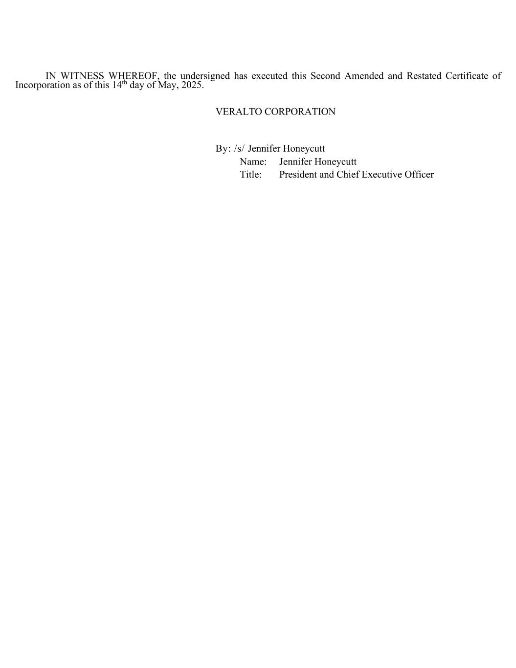 IN WITNESS WHEREOF, the undersigned has executed this Second Amended and Restated Certificate of Incorporation as of this 14th day of May, 2025. VERALTO CORPORATION By: /s/ Jennifer Honeycutt Name: Jennifer Honeycutt Title: President and Chief Executive Officer