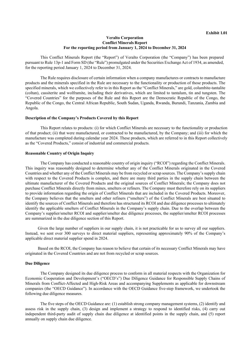 • The Company contacted each supplier and requested the name and contact details for the person responsible for the supplier’s Conflict Minerals compliance. • The Company emailed to each such supplier contact a copy of the Company Policy and a link to the CMRT and requested that such supplier return to the Company a completed CMRT with respect to all components and materials that such supplier provides to the Company. • As necessary, the Company educated suppliers regarding the reasons for requesting the Conflict Minerals data and answered supplier questions relating thereto. • The Company followed up with the suppliers that did not respond to the Company’s initial outreach and also followed up with suppliers who submitted data that appeared to be incomplete or incorrect. • The Company amalgamated the supplier-provided smelters into a single list of unique smelters. Some of the suppliers were unable to identify the smelters or countries of origin in their supply chain, some Suppliers responded by providing information related to all of the items the supplier produces without identifying smelters specific to the items purchased by the Company, and some suppliers included names of smelters that we believe may have been misidentified as smelters or that are not operational. The responses provided by the suppliers resulted in the identification of 374 unique smelters. The Company determined that 78 of these smelters source, or there is reason to believe that they source, from the Covered Countries; the Company did not audit these smelters, but instead relied on the RMI’s Responsible Minerals Assurance Process (“RMAP”), and if the smelter has not been audited and recognized as conflict free by the RMAP, the Company conducted risk mitigation on the smelter according to Step 3B of the OECD Guidance. Due to the lack of detail provided by the suppliers, the Company was unable to confirm that the necessary Conflict Minerals in its products were processed by any particular smelter or smelters and is, therefore, unable to identify the processing facilities, country of origin or mine or location of origin of such Conflict Minerals. Annual Report on Supply Chain Due Diligence In accordance with Section 5 of the OECD Guidance, this Conflict Minerals Report has been filed with the U.S. Securities and Exchange Commission. The Conflict Minerals Report is also available at www.veralto.com (under the heading “Investors” and “Corporate Governance”). Risk Mitigation and Due Diligence Improvement The Company expects to take the following steps to improve its due diligence measures and to further mitigate the risk that the necessary Conflict Minerals contained in the Company’s products finance or benefit armed groups in the Covered Countries: • Continuing to seek to include in new supplier contracts a commitment by the supplier to take steps necessary to (a) enable the Company to comply with the Rule, and (b) with respect to smelters in Veralto’s supply chain that source from the Covered Countries, source only from smelters that have obtained a “conflict-free” designation from an independent, third-party auditor; and • Continuing to engage with suppliers to improve the accuracy and completeness of the information provided to the Company about the Company’s supply chain. Cautionary Statement About Forward-Looking Statements Certain statements included in this report are “forward-looking statements” within the meaning of the U.S. federal securities laws. All statements other than historical factual information are forward-looking statements. Forward-looking statements are based on assumptions and assessments made by our management in light of their experience and perceptions of historical trends, current conditions, expected future developments and other factors they believe to be appropriate. Forward-looking statements are not guarantees of future outcomes; actual outcomes may differ materially from the outcomes contemplated by our forward-looking statements, and you should not place undue reliance on any such forward-looking statements. Information regarding the factors that may cause actual outcomes to differ materially from these forward-looking statements is available in our SEC filings, including our 2024 Annual Report on Form 10-K and Quarterly Report on Form 10-Q for the first quarter of 2025. These forward-looking statements speak only as of the date of this report and except as required by applicable law the Company does not assume any obligation to update or revise any forward- looking statement, whether as a result of new information, future events and developments or otherwise.