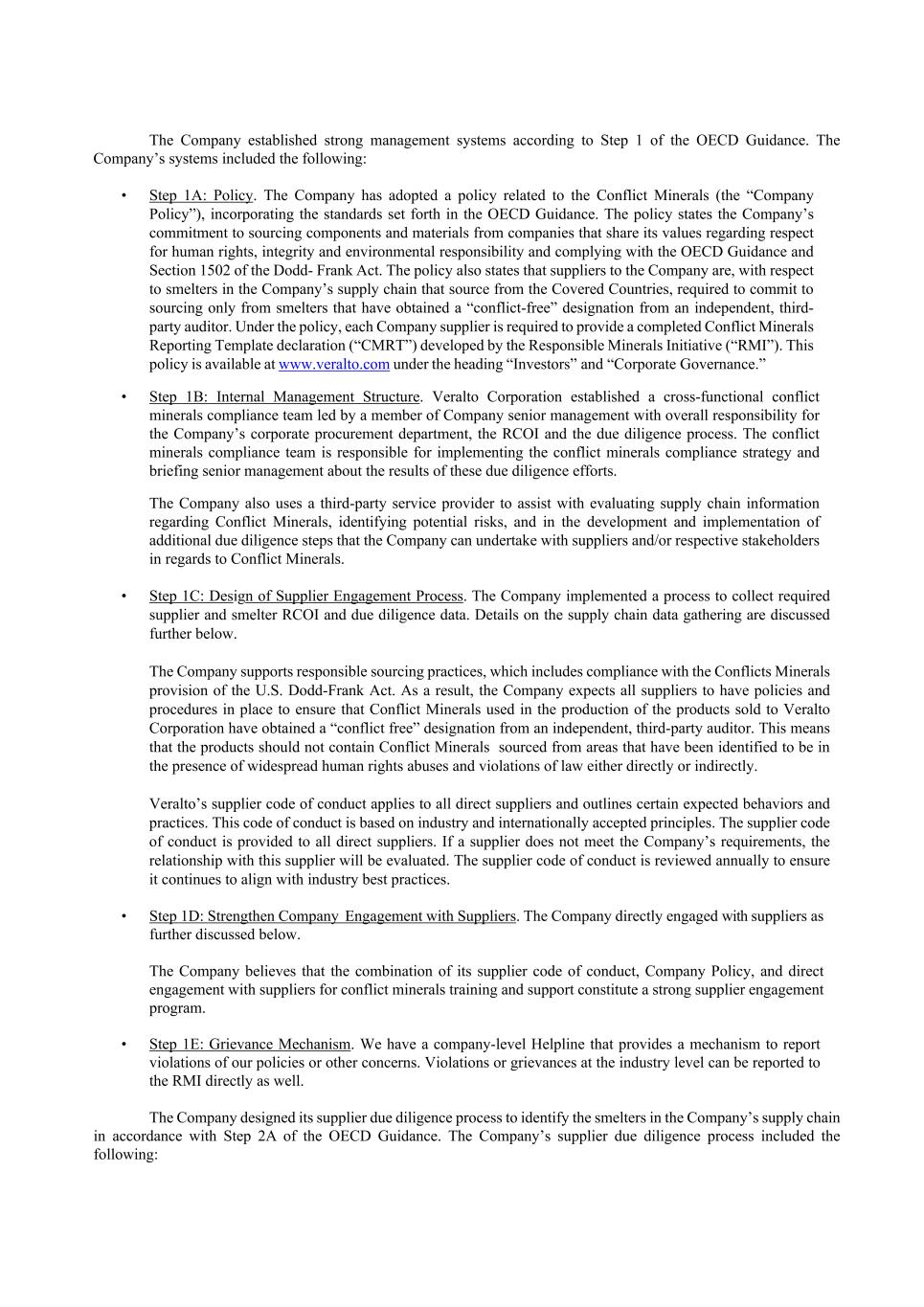 The Company established strong management systems according to Step 1 of the OECD Guidance. The Company’s systems included the following: • Step 1A: Policy. The Company has adopted a policy related to the Conflict Minerals (the “Company Policy”), incorporating the standards set forth in the OECD Guidance. The policy states the Company’s commitment to sourcing components and materials from companies that share its values regarding respect for human rights, integrity and environmental responsibility and complying with the OECD Guidance and Section 1502 of the Dodd- Frank Act. The policy also states that suppliers to the Company are, with respect to smelters in the Company’s supply chain that source from the Covered Countries, required to commit to sourcing only from smelters that have obtained a “conflict-free” designation from an independent, third- party auditor. Under the policy, each Company supplier is required to provide a completed Conflict Minerals Reporting Template declaration (“CMRT”) developed by the Responsible Minerals Initiative (“RMI”). This policy is available at www.veralto.com under the heading “Investors” and “Corporate Governance.” • Step 1B: Internal Management Structure. Veralto Corporation established a cross-functional conflict minerals compliance team led by a member of Company senior management with overall responsibility for the Company’s corporate procurement department, the RCOI and the due diligence process. The conflict minerals compliance team is responsible for implementing the conflict minerals compliance strategy and briefing senior management about the results of these due diligence efforts. The Company also uses a third-party service provider to assist with evaluating supply chain information regarding Conflict Minerals, identifying potential risks, and in the development and implementation of additional due diligence steps that the Company can undertake with suppliers and/or respective stakeholders in regards to Conflict Minerals. • Step 1C: Design of Supplier Engagement Process. The Company implemented a process to collect required supplier and smelter RCOI and due diligence data. Details on the supply chain data gathering are discussed further below. The Company supports responsible sourcing practices, which includes compliance with the Conflicts Minerals provision of the U.S. Dodd-Frank Act. As a result, the Company expects all suppliers to have policies and procedures in place to ensure that Conflict Minerals used in the production of the products sold to Veralto Corporation have obtained a “conflict free” designation from an independent, third-party auditor. This means that the products should not contain Conflict Minerals sourced from areas that have been identified to be in the presence of widespread human rights abuses and violations of law either directly or indirectly. Veralto’s supplier code of conduct applies to all direct suppliers and outlines certain expected behaviors and practices. This code of conduct is based on industry and internationally accepted principles. The supplier code of conduct is provided to all direct suppliers. If a supplier does not meet the Company’s requirements, the relationship with this supplier will be evaluated. The supplier code of conduct is reviewed annually to ensure it continues to align with industry best practices. • Step 1D: Strengthen Company Engagement with Suppliers. The Company directly engaged with suppliers as further discussed below. The Company believes that the combination of its supplier code of conduct, Company Policy, and direct engagement with suppliers for conflict minerals training and support constitute a strong supplier engagement program. • Step 1E: Grievance Mechanism. We have a company-level Helpline that provides a mechanism to report violations of our policies or other concerns. Violations or grievances at the industry level can be reported to the RMI directly as well. The Company designed its supplier due diligence process to identify the smelters in the Company’s supply chain in accordance with Step 2A of the OECD Guidance. The Company’s supplier due diligence process included the following: