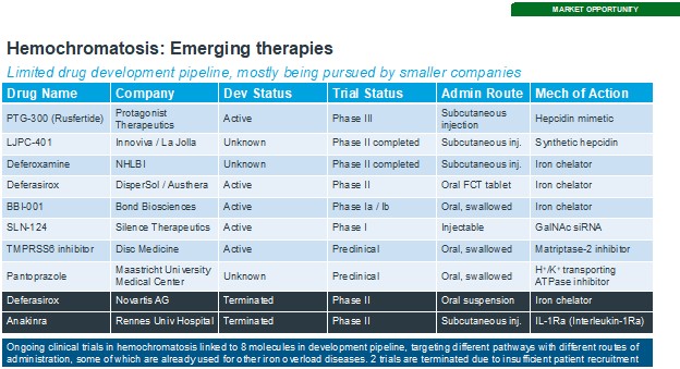 According to the CDC, hemochromatosis is a disorder in which the body builds up too much iron in the skin, heart, liver, pancreas, pituitary glands, and joints. This overload of iron is toxic to the body, and over time, the high levels of iron can damage tissues and organs and lead to conditions such as liver damage, liver cancer, heart problems, arthritis, and diabetes. Other conditions associated with high iron levels include inflammatory conditions, chronic kidney disease, and autoimmune disorders. Hemochromatosis is a life-long condition requiring regular treatment to avoid long-term serious effects with poor pharmacologic options. The most used treatment for hemochromatosis is phlebotomy, a procedure to remove some of the patient’s blood. Phlebotomy is relatively inexpensive, well accepted, and well tolerated, but it requires regular visits to health care professionals and blood draws and may not be appropriate for all patients. Additionally, iron chelators, which are molecules that bind to iron to help the body excrete it, are sometimes used, but they have limited use due to gastrointestinal and kidney toxicity issues. Iron chelators can be natural or synthetic and are used to treat iron overload, which can occur after regular blood transfusions. Despite the presence of these potential treatment options, we believe significant unmet need remains such that an innovative therapy achieving reduction in iron overload with a new profile could be subject to widespread use.