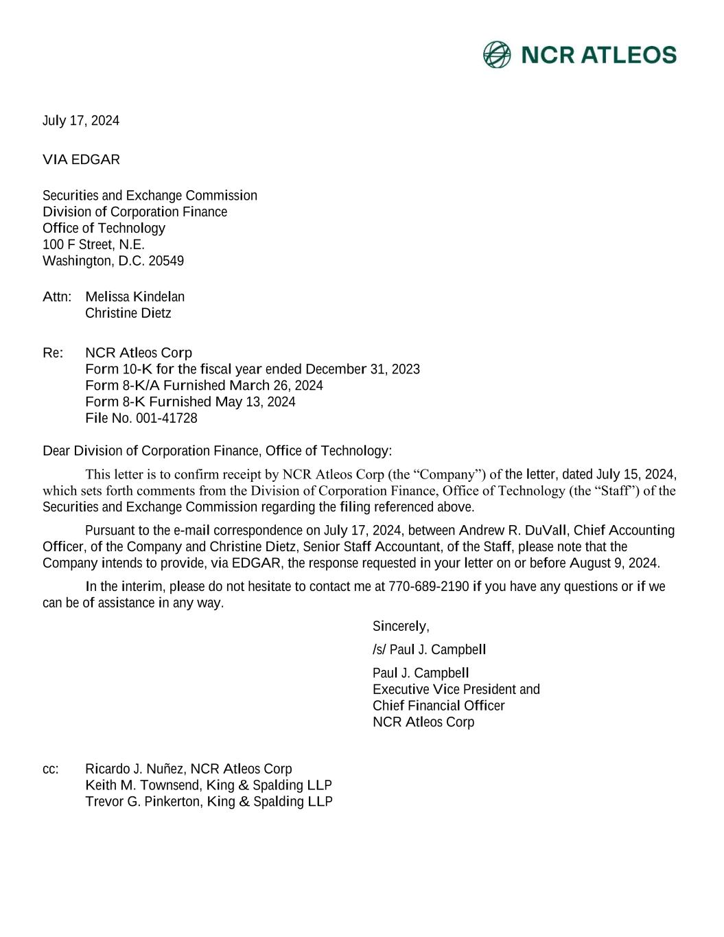 July 17, 2024 VIA EDGAR Securities and Exchange Commission Division of Corporation Finance Office of Technology 100 F Street, N.E. Washington, D.C. 20549 Attn: Melissa Kindelan Christine Dietz Re: NCR Atleos Corp Form 10-K for the fiscal year ended December 31, 2023 Form 8-K/A Furnished March 26, 2024 Form 8-K Furnished May 13, 2024 File No. 001-41728 Dear Division of Corporation Finance, Office of Technology: This letter is to confirm receipt by NCR Atleos Corp (the “Company”) of the letter, dated July 15, 2024, which sets forth comments from the Division of Corporation Finance, Office of Technology (the “Staff”) of the Securities and Exchange Commission regarding the filing referenced above. Pursuant to the e-mail correspondence on July 17, 2024, between Andrew R. DuVall, Chief Accounting Officer, of the Company and Christine Dietz, Senior Staff Accountant, of the Staff, please note that the Company intends to provide, via EDGAR, the response requested in your letter on or before August 9, 2024. In the interim, please do not hesitate to contact me at 770-689-2190 if you have any questions or if we can be of assistance in any way. Sincerely, /s/ Paul J. Campbell Paul J. Campbell Executive Vice President and Chief Financial Officer NCR Atleos Corp cc: Ricardo J. Nuñez, NCR Atleos Corp Keith M. Townsend, King & Spalding LLP Trevor G. Pinkerton, King & Spalding LLP