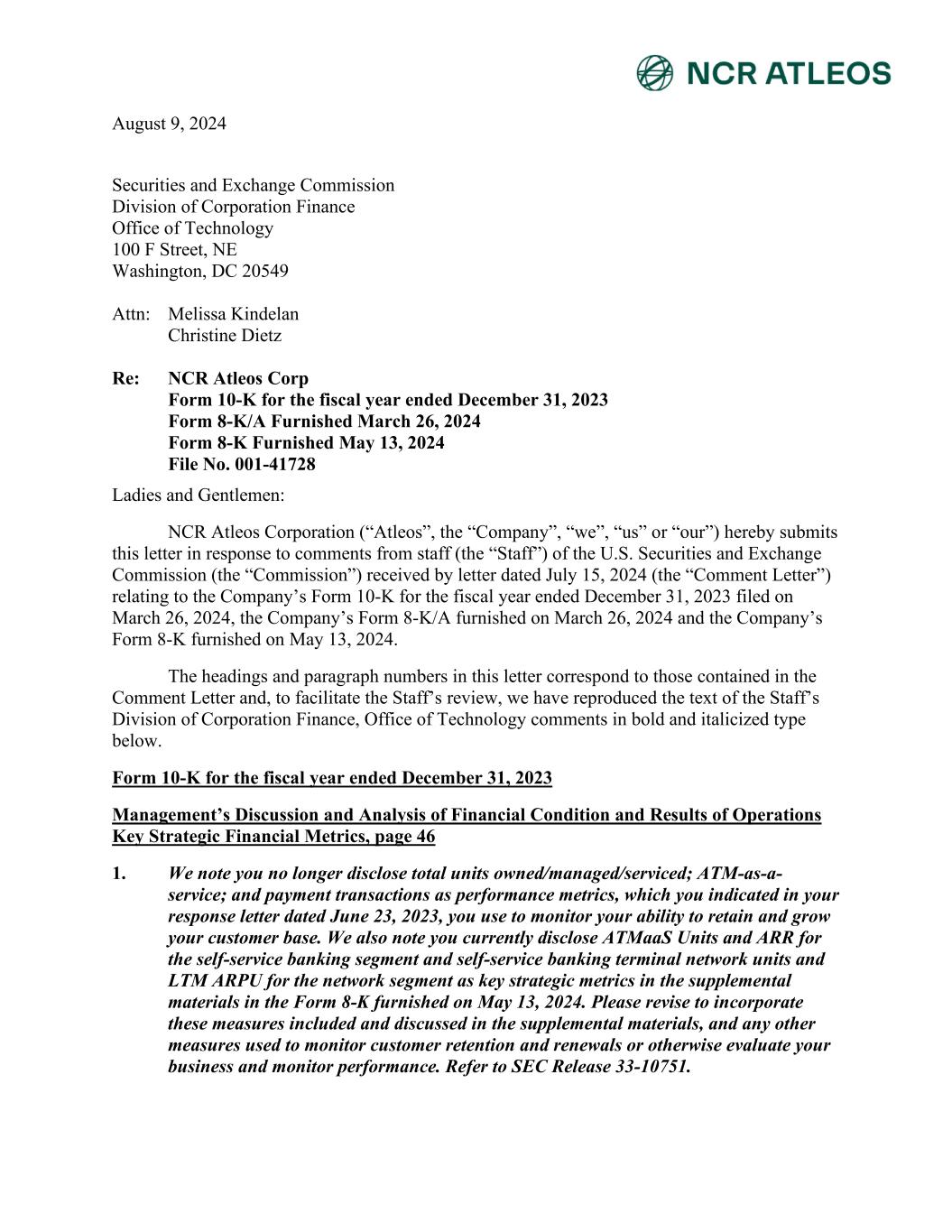 August 9, 2024 Securities and Exchange Commission Division of Corporation Finance Office of Technology 100 F Street, NE Washington, DC 20549 Attn: Melissa Kindelan Christine Dietz Re: NCR Atleos Corp Form 10-K for the fiscal year ended December 31, 2023 Form 8-K/A Furnished March 26, 2024 Form 8-K Furnished May 13, 2024 File No. 001-41728 Ladies and Gentlemen: NCR Atleos Corporation (“Atleos”, the “Company”, “we”, “us” or “our”) hereby submits this letter in response to comments from staff (the “Staff”) of the U.S. Securities and Exchange Commission (the “Commission”) received by letter dated July 15, 2024 (the “Comment Letter”) relating to the Company’s Form 10-K for the fiscal year ended December 31, 2023 filed on March 26, 2024, the Company’s Form 8-K/A furnished on March 26, 2024 and the Company’s Form 8-K furnished on May 13, 2024. The headings and paragraph numbers in this letter correspond to those contained in the Comment Letter and, to facilitate the Staff’s review, we have reproduced the text of the Staff’s Division of Corporation Finance, Office of Technology comments in bold and italicized type below. Form 10-K for the fiscal year ended December 31, 2023 Management’s Discussion and Analysis of Financial Condition and Results of Operations Key Strategic Financial Metrics, page 46 1. We note you no longer disclose total units owned/managed/serviced; ATM-as-a- service; and payment transactions as performance metrics, which you indicated in your response letter dated June 23, 2023, you use to monitor your ability to retain and grow your customer base. We also note you currently disclose ATMaaS Units and ARR for the self-service banking segment and self-service banking terminal network units and LTM ARPU for the network segment as key strategic metrics in the supplemental materials in the Form 8-K furnished on May 13, 2024. Please revise to incorporate these measures included and discussed in the supplemental materials, and any other measures used to monitor customer retention and renewals or otherwise evaluate your business and monitor performance. Refer to SEC Release 33-10751.