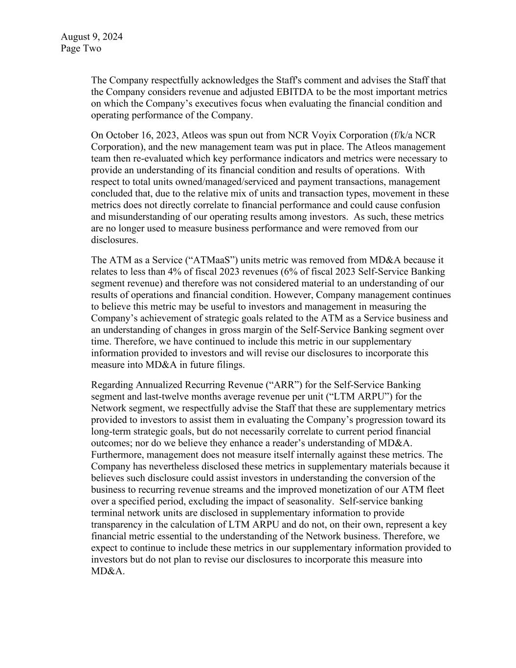 August 9, 2024 Page Two The Company respectfully acknowledges the Staff's comment and advises the Staff that the Company considers revenue and adjusted EBITDA to be the most important metrics on which the Company’s executives focus when evaluating the financial condition and operating performance of the Company. On October 16, 2023, Atleos was spun out from NCR Voyix Corporation (f/k/a NCR Corporation), and the new management team was put in place. The Atleos management team then re-evaluated which key performance indicators and metrics were necessary to provide an understanding of its financial condition and results of operations. With respect to total units owned/managed/serviced and payment transactions, management concluded that, due to the relative mix of units and transaction types, movement in these metrics does not directly correlate to financial performance and could cause confusion and misunderstanding of our operating results among investors. As such, these metrics are no longer used to measure business performance and were removed from our disclosures. The ATM as a Service (“ATMaaS”) units metric was removed from MD&A because it relates to less than 4% of fiscal 2023 revenues (6% of fiscal 2023 Self-Service Banking segment revenue) and therefore was not considered material to an understanding of our results of operations and financial condition. However, Company management continues to believe this metric may be useful to investors and management in measuring the Company’s achievement of strategic goals related to the ATM as a Service business and an understanding of changes in gross margin of the Self-Service Banking segment over time. Therefore, we have continued to include this metric in our supplementary information provided to investors and will revise our disclosures to incorporate this measure into MD&A in future filings. Regarding Annualized Recurring Revenue (“ARR”) for the Self-Service Banking segment and last-twelve months average revenue per unit (“LTM ARPU”) for the Network segment, we respectfully advise the Staff that these are supplementary metrics provided to investors to assist them in evaluating the Company’s progression toward its long-term strategic goals, but do not necessarily correlate to current period financial outcomes; nor do we believe they enhance a reader’s understanding of MD&A. Furthermore, management does not measure itself internally against these metrics. The Company has nevertheless disclosed these metrics in supplementary materials because it believes such disclosure could assist investors in understanding the conversion of the business to recurring revenue streams and the improved monetization of our ATM fleet over a specified period, excluding the impact of seasonality. Self-service banking terminal network units are disclosed in supplementary information to provide transparency in the calculation of LTM ARPU and do not, on their own, represent a key financial metric essential to the understanding of the Network business. Therefore, we expect to continue to include these metrics in our supplementary information provided to investors but do not plan to revise our disclosures to incorporate this measure into MD&A.