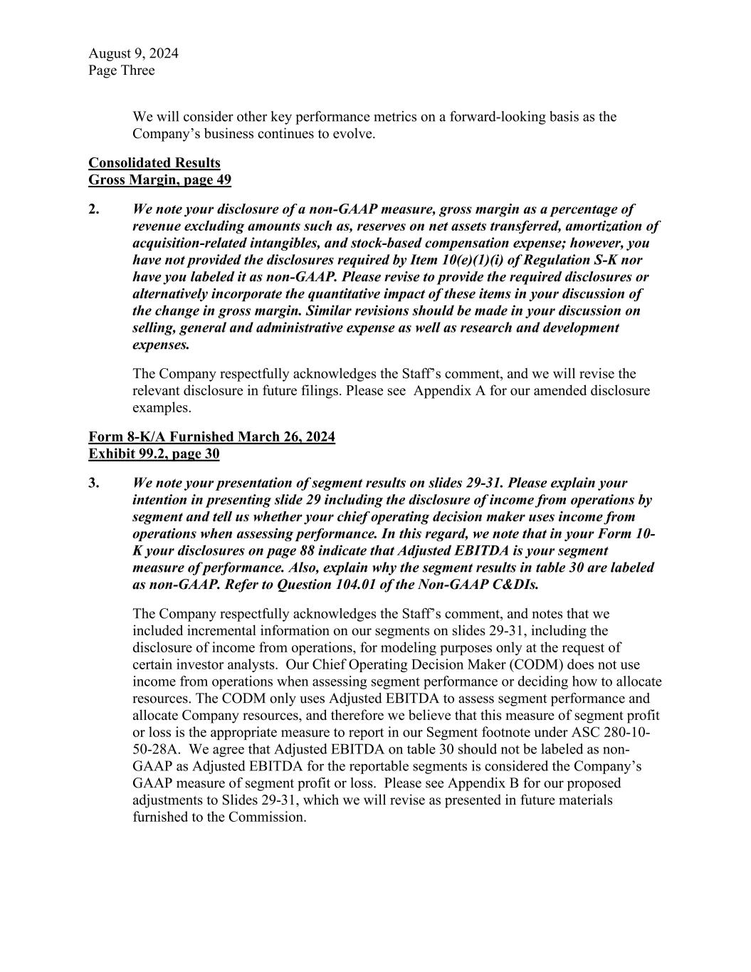 August 9, 2024 Page Three We will consider other key performance metrics on a forward-looking basis as the Company’s business continues to evolve. Consolidated Results Gross Margin, page 49 2. We note your disclosure of a non-GAAP measure, gross margin as a percentage of revenue excluding amounts such as, reserves on net assets transferred, amortization of acquisition-related intangibles, and stock-based compensation expense; however, you have not provided the disclosures required by Item 10(e)(1)(i) of Regulation S-K nor have you labeled it as non-GAAP. Please revise to provide the required disclosures or alternatively incorporate the quantitative impact of these items in your discussion of the change in gross margin. Similar revisions should be made in your discussion on selling, general and administrative expense as well as research and development expenses. The Company respectfully acknowledges the Staff’s comment, and we will revise the relevant disclosure in future filings. Please see Appendix A for our amended disclosure examples. Form 8-K/A Furnished March 26, 2024 Exhibit 99.2, page 30 3. We note your presentation of segment results on slides 29-31. Please explain your intention in presenting slide 29 including the disclosure of income from operations by segment and tell us whether your chief operating decision maker uses income from operations when assessing performance. In this regard, we note that in your Form 10- K your disclosures on page 88 indicate that Adjusted EBITDA is your segment measure of performance. Also, explain why the segment results in table 30 are labeled as non-GAAP. Refer to Question 104.01 of the Non-GAAP C&DIs. The Company respectfully acknowledges the Staff’s comment, and notes that we included incremental information on our segments on slides 29-31, including the disclosure of income from operations, for modeling purposes only at the request of certain investor analysts. Our Chief Operating Decision Maker (CODM) does not use income from operations when assessing segment performance or deciding how to allocate resources. The CODM only uses Adjusted EBITDA to assess segment performance and allocate Company resources, and therefore we believe that this measure of segment profit or loss is the appropriate measure to report in our Segment footnote under ASC 280-10- 50-28A. We agree that Adjusted EBITDA on table 30 should not be labeled as non- GAAP as Adjusted EBITDA for the reportable segments is considered the Company’s GAAP measure of segment profit or loss. Please see Appendix B for our proposed adjustments to Slides 29-31, which we will revise as presented in future materials furnished to the Commission.