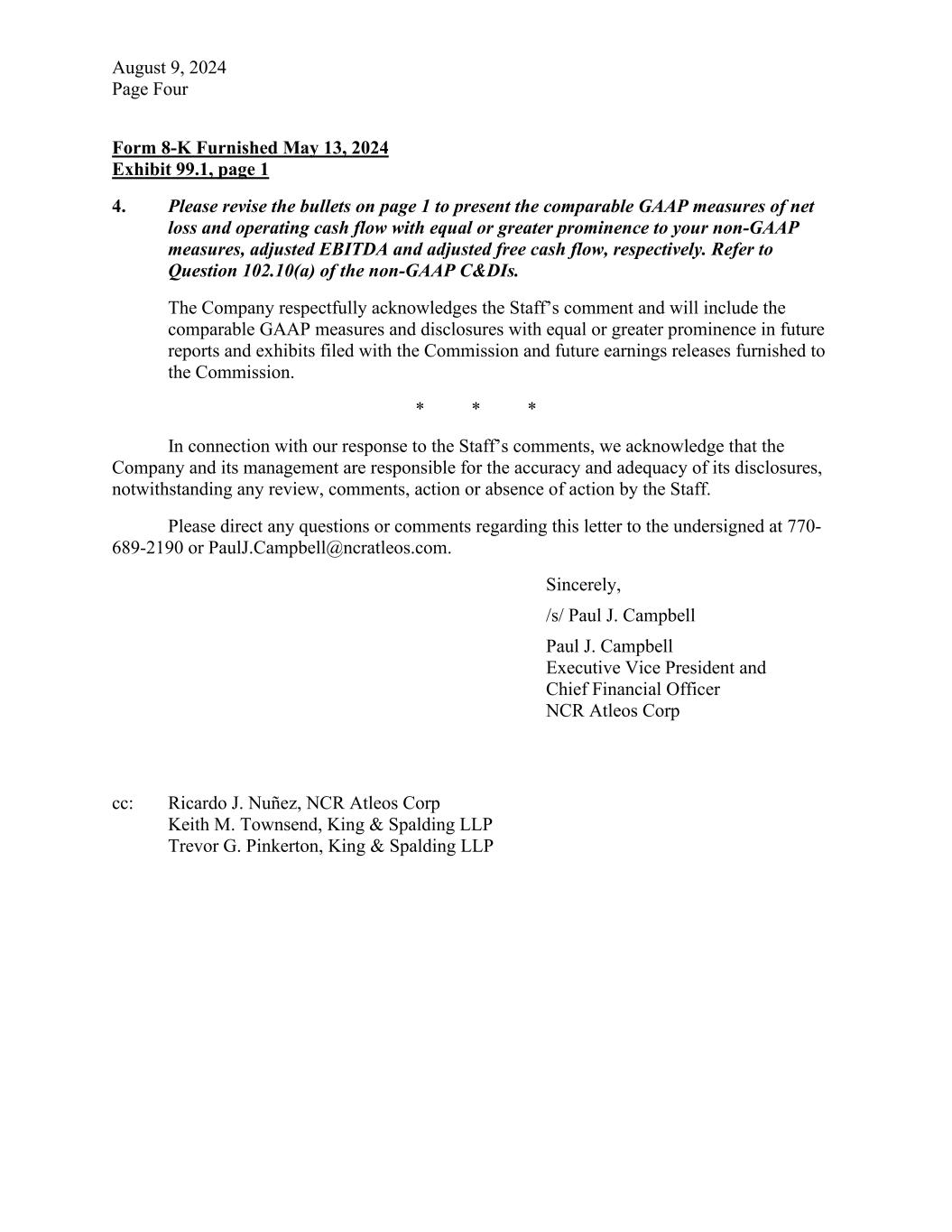 August 9, 2024 Page Four Form 8-K Furnished May 13, 2024 Exhibit 99.1, page 1 4. Please revise the bullets on page 1 to present the comparable GAAP measures of net loss and operating cash flow with equal or greater prominence to your non-GAAP measures, adjusted EBITDA and adjusted free cash flow, respectively. Refer to Question 102.10(a) of the non-GAAP C&DIs. The Company respectfully acknowledges the Staff’s comment and will include the comparable GAAP measures and disclosures with equal or greater prominence in future reports and exhibits filed with the Commission and future earnings releases furnished to the Commission. * * * In connection with our response to the Staff’s comments, we acknowledge that the Company and its management are responsible for the accuracy and adequacy of its disclosures, notwithstanding any review, comments, action or absence of action by the Staff. Please direct any questions or comments regarding this letter to the undersigned at 770- 689-2190 or PaulJ.Campbell@ncratleos.com. Sincerely, /s/ Paul J. Campbell Paul J. Campbell Executive Vice President and Chief Financial Officer NCR Atleos Corp cc: Ricardo J. Nuñez, NCR Atleos Corp Keith M. Townsend, King & Spalding LLP Trevor G. Pinkerton, King & Spalding LLP