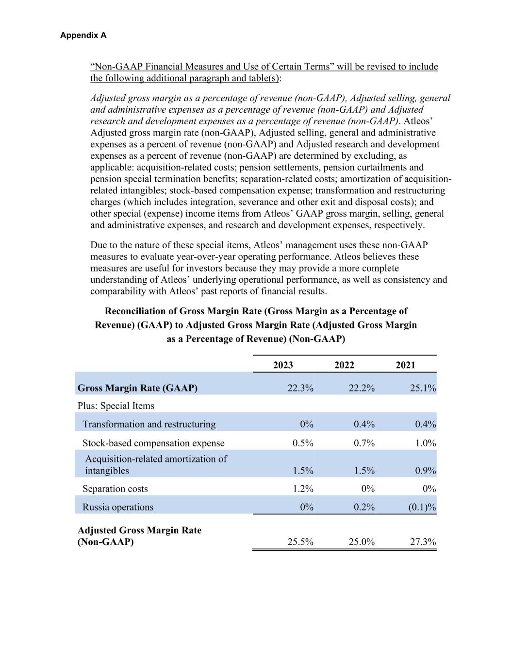Appendix A “Non-GAAP Financial Measures and Use of Certain Terms” will be revised to include the following additional paragraph and table(s): Adjusted gross margin as a percentage of revenue (non-GAAP), Adjusted selling, general and administrative expenses as a percentage of revenue (non-GAAP) and Adjusted research and development expenses as a percentage of revenue (non-GAAP). Atleos’ Adjusted gross margin rate (non-GAAP), Adjusted selling, general and administrative expenses as a percent of revenue (non-GAAP) and Adjusted research and development expenses as a percent of revenue (non-GAAP) are determined by excluding, as applicable: acquisition-related costs; pension settlements, pension curtailments and pension special termination benefits; separation-related costs; amortization of acquisition- related intangibles; stock-based compensation expense; transformation and restructuring charges (which includes integration, severance and other exit and disposal costs); and other special (expense) income items from Atleos’ GAAP gross margin, selling, general and administrative expenses, and research and development expenses, respectively. Due to the nature of these special items, Atleos’ management uses these non-GAAP measures to evaluate year-over-year operating performance. Atleos believes these measures are useful for investors because they may provide a more complete understanding of Atleos’ underlying operational performance, as well as consistency and comparability with Atleos’ past reports of financial results. Reconciliation of Gross Margin Rate (Gross Margin as a Percentage of Revenue) (GAAP) to Adjusted Gross Margin Rate (Adjusted Gross Margin as a Percentage of Revenue) (Non-GAAP) 2023 2022 2021 Gross Margin Rate (GAAP) 22.3% 22.2% 25.1% Plus: Special Items Transformation and restructuring 0% 0.4% 0.4% Stock-based compensation expense 0.5% 0.7% 1.0% Acquisition-related amortization of intangibles 1.5% 1.5% 0.9% Separation costs 1.2% 0% 0% Russia operations 0% 0.2% (0.1)% Adjusted Gross Margin Rate (Non-GAAP) 25.5% 25.0% 27.3%
