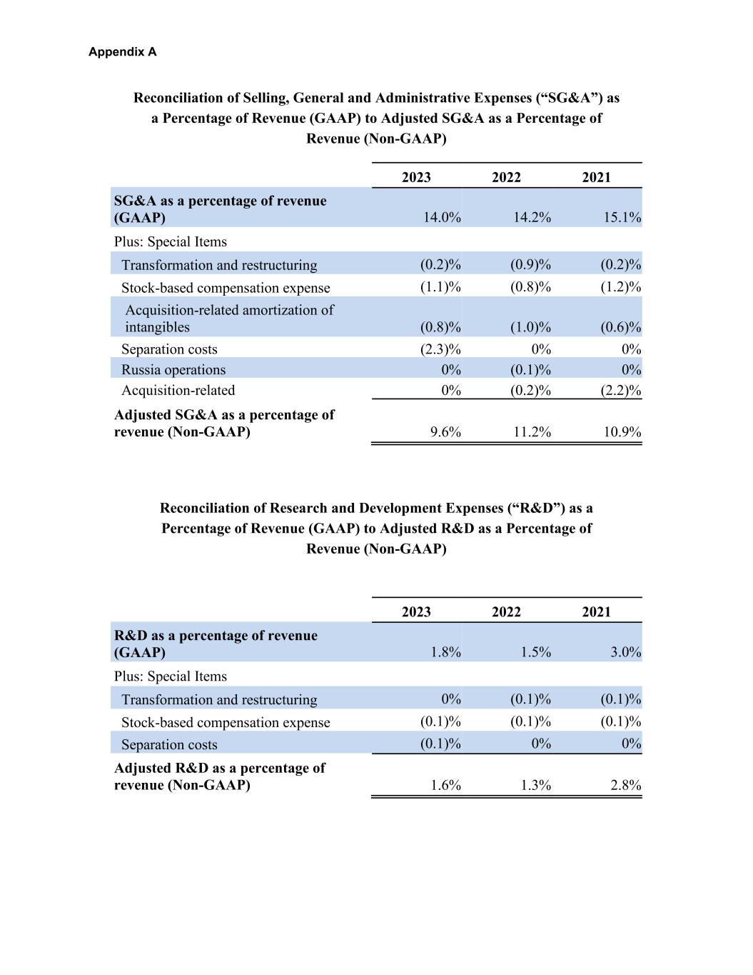 Appendix A Reconciliation of Selling, General and Administrative Expenses (“SG&A”) as a Percentage of Revenue (GAAP) to Adjusted SG&A as a Percentage of Revenue (Non-GAAP) 2023 2022 2021 SG&A as a percentage of revenue (GAAP) 14.0% 14.2% 15.1% Plus: Special Items Transformation and restructuring (0.2)% (0.9)% (0.2)% Stock-based compensation expense (1.1)% (0.8)% (1.2)% Acquisition-related amortization of intangibles (0.8)% (1.0)% (0.6)% Separation costs (2.3)% 0% 0% Russia operations 0% (0.1)% 0% Acquisition-related 0% (0.2)% (2.2)% Adjusted SG&A as a percentage of revenue (Non-GAAP) 9.6% 11.2% 10.9% Reconciliation of Research and Development Expenses (“R&D”) as a Percentage of Revenue (GAAP) to Adjusted R&D as a Percentage of Revenue (Non-GAAP) 2023 2022 2021 R&D as a percentage of revenue (GAAP) 1.8% 1.5% 3.0% Plus: Special Items Transformation and restructuring 0% (0.1)% (0.1)% Stock-based compensation expense (0.1)% (0.1)% (0.1)% Separation costs (0.1)% 0% 0% Adjusted R&D as a percentage of revenue (Non-GAAP) 1.6% 1.3% 2.8%