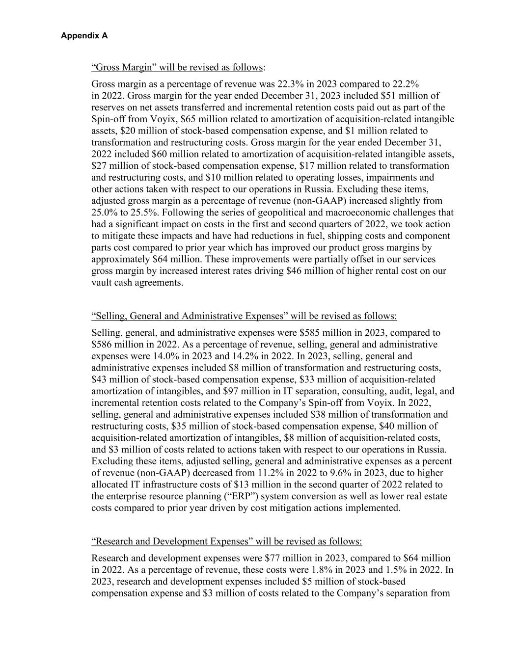 Appendix A “Gross Margin” will be revised as follows: Gross margin as a percentage of revenue was 22.3% in 2023 compared to 22.2% in 2022. Gross margin for the year ended December 31, 2023 included $51 million of reserves on net assets transferred and incremental retention costs paid out as part of the Spin-off from Voyix, $65 million related to amortization of acquisition-related intangible assets, $20 million of stock-based compensation expense, and $1 million related to transformation and restructuring costs. Gross margin for the year ended December 31, 2022 included $60 million related to amortization of acquisition-related intangible assets, $27 million of stock-based compensation expense, $17 million related to transformation and restructuring costs, and $10 million related to operating losses, impairments and other actions taken with respect to our operations in Russia. Excluding these items, adjusted gross margin as a percentage of revenue (non-GAAP) increased slightly from 25.0% to 25.5%. Following the series of geopolitical and macroeconomic challenges that had a significant impact on costs in the first and second quarters of 2022, we took action to mitigate these impacts and have had reductions in fuel, shipping costs and component parts cost compared to prior year which has improved our product gross margins by approximately $64 million. These improvements were partially offset in our services gross margin by increased interest rates driving $46 million of higher rental cost on our vault cash agreements. “Selling, General and Administrative Expenses” will be revised as follows: Selling, general, and administrative expenses were $585 million in 2023, compared to $586 million in 2022. As a percentage of revenue, selling, general and administrative expenses were 14.0% in 2023 and 14.2% in 2022. In 2023, selling, general and administrative expenses included $8 million of transformation and restructuring costs, $43 million of stock-based compensation expense, $33 million of acquisition-related amortization of intangibles, and $97 million in IT separation, consulting, audit, legal, and incremental retention costs related to the Company’s Spin-off from Voyix. In 2022, selling, general and administrative expenses included $38 million of transformation and restructuring costs, $35 million of stock-based compensation expense, $40 million of acquisition-related amortization of intangibles, $8 million of acquisition-related costs, and $3 million of costs related to actions taken with respect to our operations in Russia. Excluding these items, adjusted selling, general and administrative expenses as a percent of revenue (non-GAAP) decreased from 11.2% in 2022 to 9.6% in 2023, due to higher allocated IT infrastructure costs of $13 million in the second quarter of 2022 related to the enterprise resource planning (“ERP”) system conversion as well as lower real estate costs compared to prior year driven by cost mitigation actions implemented. “Research and Development Expenses” will be revised as follows: Research and development expenses were $77 million in 2023, compared to $64 million in 2022. As a percentage of revenue, these costs were 1.8% in 2023 and 1.5% in 2022. In 2023, research and development expenses included $5 million of stock-based compensation expense and $3 million of costs related to the Company’s separation from