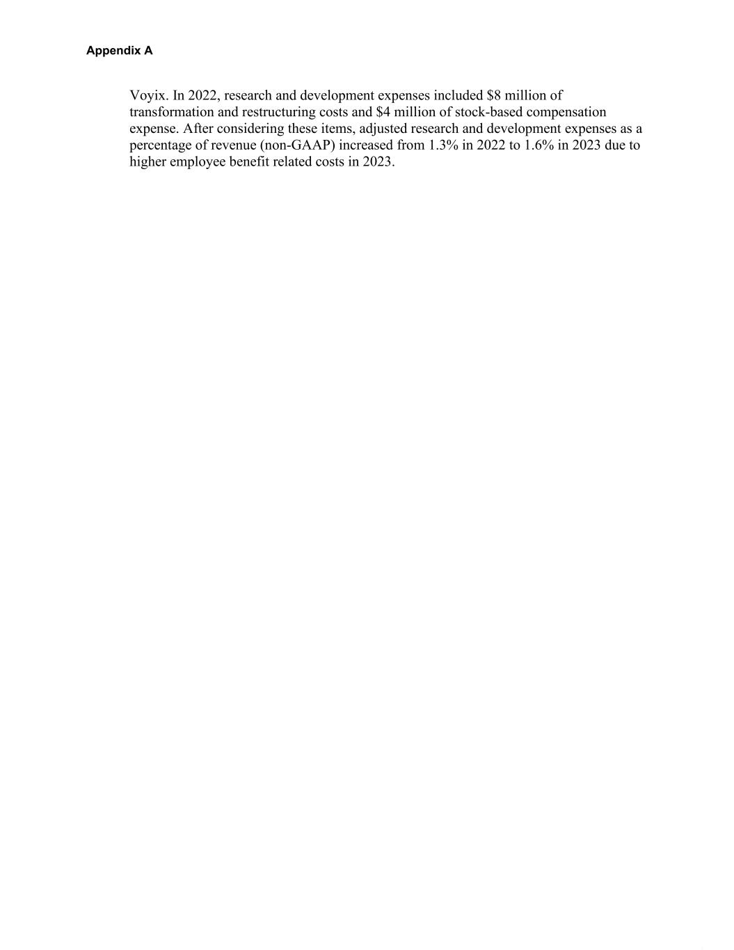 Appendix A Voyix. In 2022, research and development expenses included $8 million of transformation and restructuring costs and $4 million of stock-based compensation expense. After considering these items, adjusted research and development expenses as a percentage of revenue (non-GAAP) increased from 1.3% in 2022 to 1.6% in 2023 due to higher employee benefit related costs in 2023.