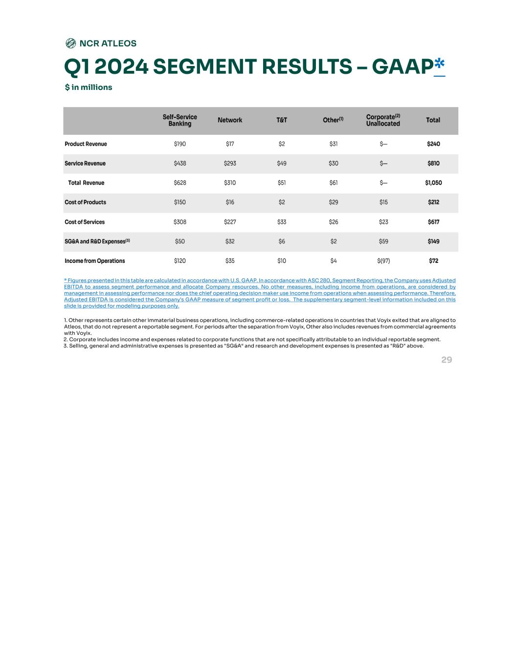 Q1 2024 SEGMENT RESULTS – GAAP* $ in millions * Figures presented in this table are calculated in accordance with U.S. GAAP. In accordance with ASC 280, Segment Reporting, the Company uses Adjusted EBITDA to assess segment performance and allocate Company resources. No other measures, including income from operations, are considered by management in assessing performance nor does the chief operating decision maker use income from operations when assessing performance. Therefore, Adjusted EBITDA is considered the Company’s GAAP measure of segment profit or loss. The supplementary segment-level information included on this slide is provided for modeling purposes only. 1. Other represents certain other immaterial business operations, including commerce-related operations in countries that Voyix exited that are aligned to Atleos, that do not represent a reportable segment. For periods after the separation from Voyix, Other also includes revenues from commercial agreements with Voyix. 2. Corporate includes income and expenses related to corporate functions that are not specifically attributable to an individual reportable segment. 3. Selling, general and administrative expenses is presented as "SG&A“ and research and development expenses is presented as "R&D" above. 29