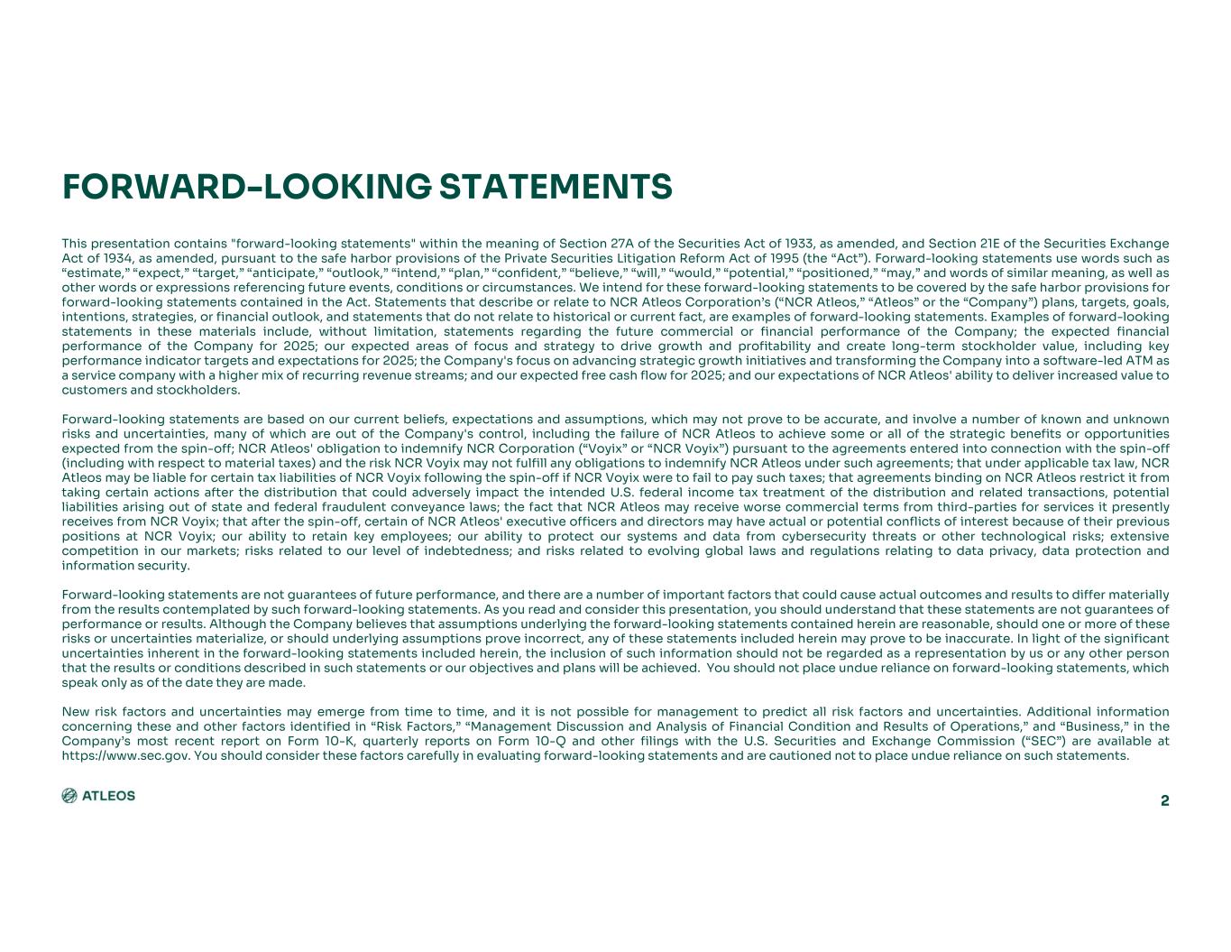 2 This presentation contains "forward-looking statements" within the meaning of Section 27A of the Securities Act of 1933, as amended, and Section 21E of the Securities Exchange Act of 1934, as amended, pursuant to the safe harbor provisions of the Private Securities Litigation Reform Act of 1995 (the “Act”). Forward-looking statements use words such as “estimate,” “expect,” “target,” “anticipate,” “outlook,” “intend,” “plan,” “confident,” “believe,” “will,” “would,” “potential,” “positioned,” “may,” and words of similar meaning, as well as other words or expressions referencing future events, conditions or circumstances. We intend for these forward-looking statements to be covered by the safe harbor provisions for forward-looking statements contained in the Act. Statements that describe or relate to NCR Atleos Corporation’s (“NCR Atleos,” “Atleos” or the “Company”) plans, targets, goals, intentions, strategies, or financial outlook, and statements that do not relate to historical or current fact, are examples of forward-looking statements. Examples of forward-looking statements in these materials include, without limitation, statements regarding the future commercial or financial performance of the Company; the expected financial performance of the Company for 2025; our expected areas of focus and strategy to drive growth and profitability and create long-term stockholder value, including key performance indicator targets and expectations for 2025; the Company's focus on advancing strategic growth initiatives and transforming the Company into a software-led ATM as a service company with a higher mix of recurring revenue streams; and our expected free cash flow for 2025; and our expectations of NCR Atleos' ability to deliver increased value to customers and stockholders. Forward-looking statements are based on our current beliefs, expectations and assumptions, which may not prove to be accurate, and involve a number of known and unknown risks and uncertainties, many of which are out of the Company's control, including the failure of NCR Atleos to achieve some or all of the strategic benefits or opportunities expected from the spin-off; NCR Atleos' obligation to indemnify NCR Corporation (“Voyix” or “NCR Voyix”) pursuant to the agreements entered into connection with the spin-off (including with respect to material taxes) and the risk NCR Voyix may not fulfill any obligations to indemnify NCR Atleos under such agreements; that under applicable tax law, NCR Atleos may be liable for certain tax liabilities of NCR Voyix following the spin-off if NCR Voyix were to fail to pay such taxes; that agreements binding on NCR Atleos restrict it from taking certain actions after the distribution that could adversely impact the intended U.S. federal income tax treatment of the distribution and related transactions, potential liabilities arising out of state and federal fraudulent conveyance laws; the fact that NCR Atleos may receive worse commercial terms from third-parties for services it presently receives from NCR Voyix; that after the spin-off, certain of NCR Atleos' executive officers and directors may have actual or potential conflicts of interest because of their previous positions at NCR Voyix; our ability to retain key employees; our ability to protect our systems and data from cybersecurity threats or other technological risks; extensive competition in our markets; risks related to our level of indebtedness; and risks related to evolving global laws and regulations relating to data privacy, data protection and information security. Forward-looking statements are not guarantees of future performance, and there are a number of important factors that could cause actual outcomes and results to differ materially from the results contemplated by such forward-looking statements. As you read and consider this presentation, you should understand that these statements are not guarantees of performance or results. Although the Company believes that assumptions underlying the forward-looking statements contained herein are reasonable, should one or more of these risks or uncertainties materialize, or should underlying assumptions prove incorrect, any of these statements included herein may prove to be inaccurate. In light of the significant uncertainties inherent in the forward-looking statements included herein, the inclusion of such information should not be regarded as a representation by us or any other person that the results or conditions described in such statements or our objectives and plans will be achieved. You should not place undue reliance on forward-looking statements, which speak only as of the date they are made. New risk factors and uncertainties may emerge from time to time, and it is not possible for management to predict all risk factors and uncertainties. Additional information concerning these and other factors identified in “Risk Factors,” “Management Discussion and Analysis of Financial Condition and Results of Operations,” and “Business,” in the Company’s most recent report on Form 10-K, quarterly reports on Form 10-Q and other filings with the U.S. Securities and Exchange Commission (“SEC”) are available at https://www.sec.gov. You should consider these factors carefully in evaluating forward-looking statements and are cautioned not to place undue reliance on such statements. FORWARD-LOOKING STATEMENTS