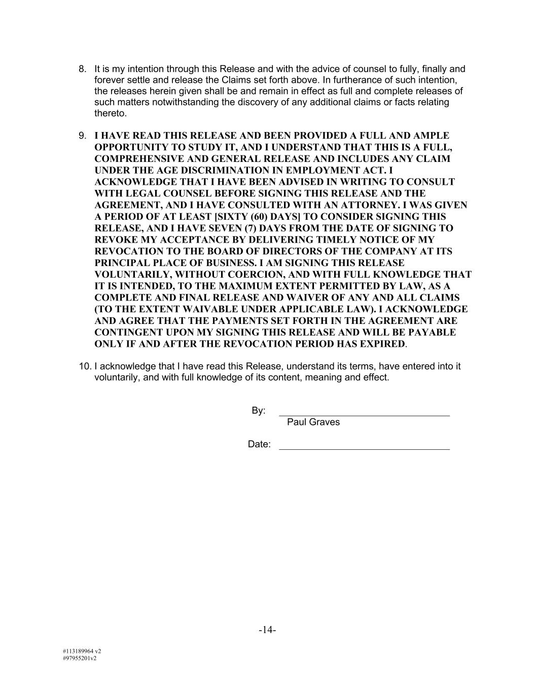 -14- #113189964 v2 #97955201v2 8. It is my intention through this Release and with the advice of counsel to fully, finally and forever settle and release the Claims set forth above. In furtherance of such intention, the releases herein given shall be and remain in effect as full and complete releases of such matters notwithstanding the discovery of any additional claims or facts relating thereto. 9. I HAVE READ THIS RELEASE AND BEEN PROVIDED A FULL AND AMPLE OPPORTUNITY TO STUDY IT, AND I UNDERSTAND THAT THIS IS A FULL, COMPREHENSIVE AND GENERAL RELEASE AND INCLUDES ANY CLAIM UNDER THE AGE DISCRIMINATION IN EMPLOYMENT ACT. I ACKNOWLEDGE THAT I HAVE BEEN ADVISED IN WRITING TO CONSULT WITH LEGAL COUNSEL BEFORE SIGNING THIS RELEASE AND THE AGREEMENT, AND I HAVE CONSULTED WITH AN ATTORNEY. I WAS GIVEN A PERIOD OF AT LEAST [SIXTY (60) DAYS] TO CONSIDER SIGNING THIS RELEASE, AND I HAVE SEVEN (7) DAYS FROM THE DATE OF SIGNING TO REVOKE MY ACCEPTANCE BY DELIVERING TIMELY NOTICE OF MY REVOCATION TO THE BOARD OF DIRECTORS OF THE COMPANY AT ITS PRINCIPAL PLACE OF BUSINESS. I AM SIGNING THIS RELEASE VOLUNTARILY, WITHOUT COERCION, AND WITH FULL KNOWLEDGE THAT IT IS INTENDED, TO THE MAXIMUM EXTENT PERMITTED BY LAW, AS A COMPLETE AND FINAL RELEASE AND WAIVER OF ANY AND ALL CLAIMS (TO THE EXTENT WAIVABLE UNDER APPLICABLE LAW). I ACKNOWLEDGE AND AGREE THAT THE PAYMENTS SET FORTH IN THE AGREEMENT ARE CONTINGENT UPON MY SIGNING THIS RELEASE AND WILL BE PAYABLE ONLY IF AND AFTER THE REVOCATION PERIOD HAS EXPIRED. 10. I acknowledge that I have read this Release, understand its terms, have entered into it voluntarily, and with full knowledge of its content, meaning and effect. By: Date: Paul Graves