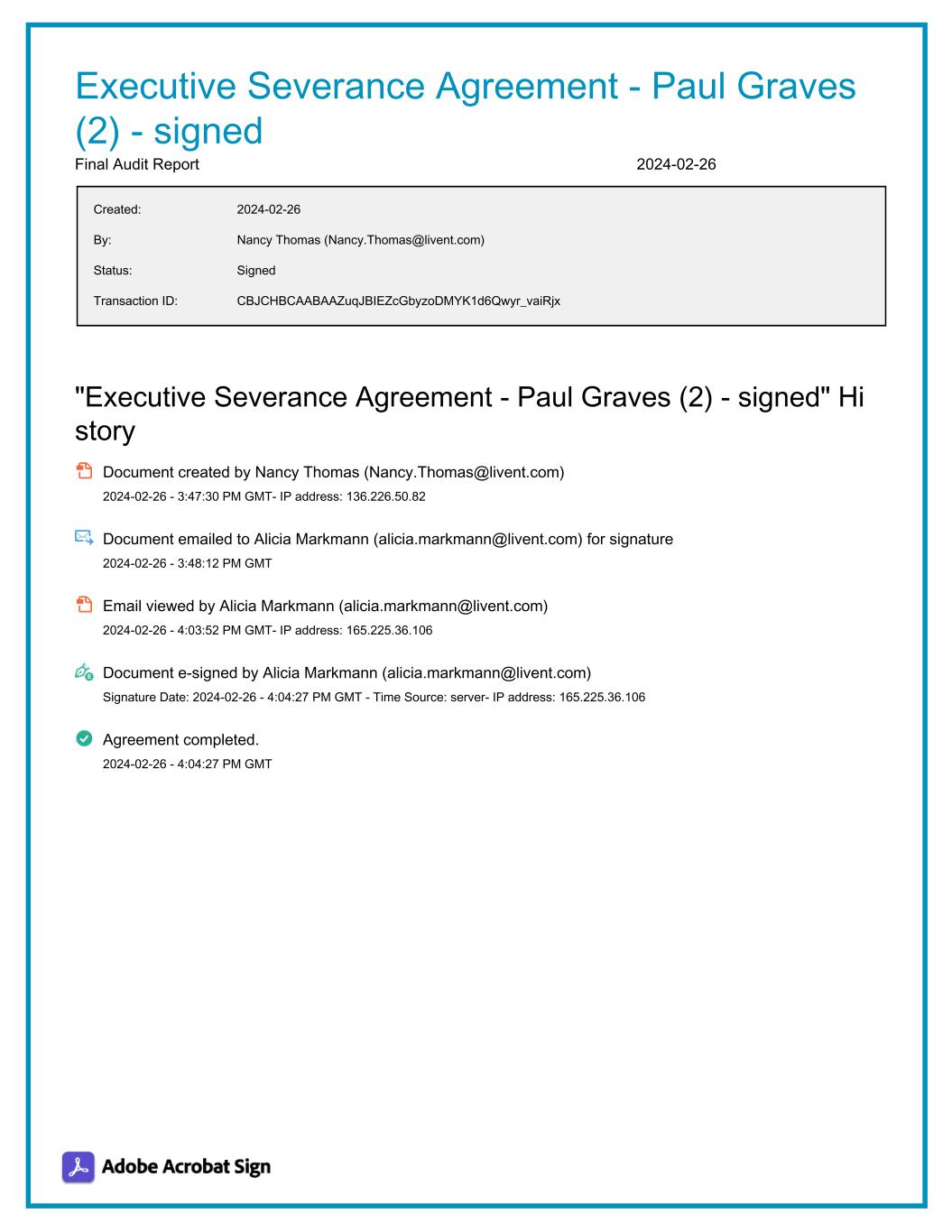 Executive Severance Agreement - Paul Graves (2) - signed Final Audit Report 2024-02-26 Created: 2024-02-26 By: Nancy Thomas (Nancy.Thomas@livent.com) Status: Signed Transaction ID: CBJCHBCAABAAZuqJBIEZcGbyzoDMYK1d6Qwyr_vaiRjx "Executive Severance Agreement - Paul Graves (2) - signed" Hi story Document created by Nancy Thomas (Nancy.Thomas@livent.com) 2024-02-26 - 3:47:30 PM GMT- IP address: 136.226.50.82 Document emailed to Alicia Markmann (alicia.markmann@livent.com) for signature 2024-02-26 - 3:48:12 PM GMT Email viewed by Alicia Markmann (alicia.markmann@livent.com) 2024-02-26 - 4:03:52 PM GMT- IP address: 165.225.36.106 Document e-signed by Alicia Markmann (alicia.markmann@livent.com) Signature Date: 2024-02-26 - 4:04:27 PM GMT - Time Source: server- IP address: 165.225.36.106 Agreement completed. 2024-02-26 - 4:04:27 PM GMT