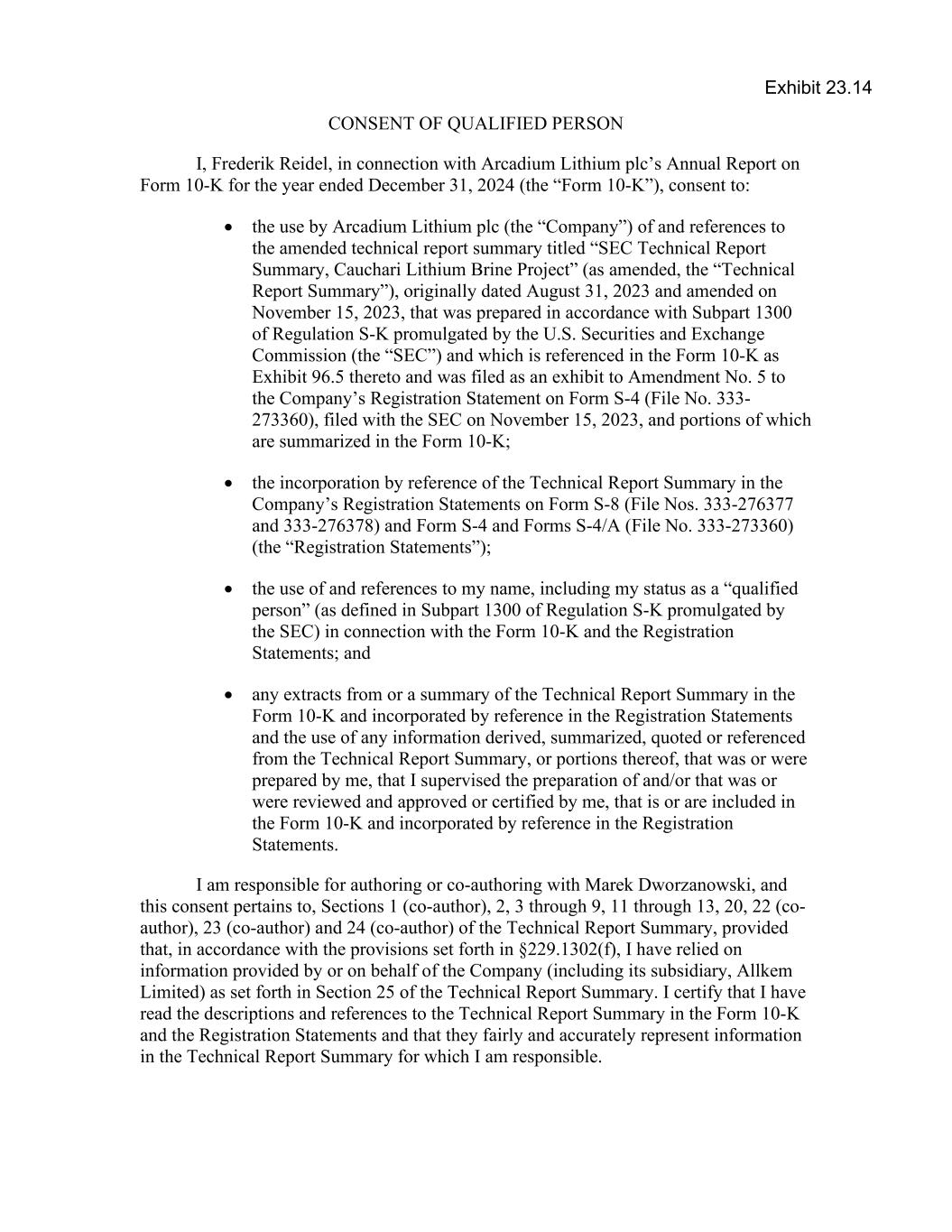 CONSENT OF QUALIFIED PERSON I, Frederik Reidel, in connection with Arcadium Lithium plc’s Annual Report on Form 10-K for the year ended December 31, 2024 (the “Form 10-K”), consent to: • the use by Arcadium Lithium plc (the “Company”) of and references to the amended technical report summary titled “SEC Technical Report Summary, Cauchari Lithium Brine Project” (as amended, the “Technical Report Summary”), originally dated August 31, 2023 and amended on November 15, 2023, that was prepared in accordance with Subpart 1300 of Regulation S-K promulgated by the U.S. Securities and Exchange Commission (the “SEC”) and which is referenced in the Form 10-K as Exhibit 96.5 thereto and was filed as an exhibit to Amendment No. 5 to the Company’s Registration Statement on Form S-4 (File No. 333- 273360), filed with the SEC on November 15, 2023, and portions of which are summarized in the Form 10-K; • the incorporation by reference of the Technical Report Summary in the Company’s Registration Statements on Form S-8 (File Nos. 333-276377 and 333-276378) and Form S-4 and Forms S-4/A (File No. 333-273360) (the “Registration Statements”); • the use of and references to my name, including my status as a “qualified person” (as defined in Subpart 1300 of Regulation S-K promulgated by the SEC) in connection with the Form 10-K and the Registration Statements; and • any extracts from or a summary of the Technical Report Summary in the Form 10-K and incorporated by reference in the Registration Statements and the use of any information derived, summarized, quoted or referenced from the Technical Report Summary, or portions thereof, that was or were prepared by me, that I supervised the preparation of and/or that was or were reviewed and approved or certified by me, that is or are included in the Form 10-K and incorporated by reference in the Registration Statements. I am responsible for authoring or co-authoring with Marek Dworzanowski, and this consent pertains to, Sections 1 (co-author), 2, 3 through 9, 11 through 13, 20, 22 (co- author), 23 (co-author) and 24 (co-author) of the Technical Report Summary, provided that, in accordance with the provisions set forth in §229.1302(f), I have relied on information provided by or on behalf of the Company (including its subsidiary, Allkem Limited) as set forth in Section 25 of the Technical Report Summary. I certify that I have read the descriptions and references to the Technical Report Summary in the Form 10-K and the Registration Statements and that they fairly and accurately represent information in the Technical Report Summary for which I am responsible. Exhibit 23.14