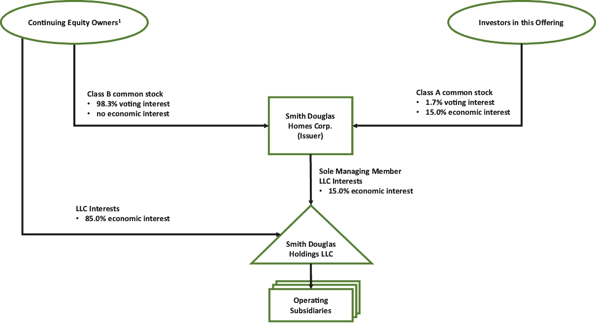 • | the Continuing Equity Owners will own (i) 43,589,743 LLC Interests of Smith Douglas Holdings LLC, representing approximately 85.0% of the economic interest in Smith Douglas Holdings LLC (or 42,435,897 LLC Interests, representing approximately 82.7% of the economic interest in Smith Douglas Holdings LLC if the underwriters exercise in full their option to purchase additional shares of Class A common stock) and (ii) 43,589,743 shares of Class B common stock of Smith Douglas Homes Corp., representing approximately 98.3% of the combined voting power of all of Smith Douglas Homes Corp.’s common stock (or 42,435,897 shares of Class B common stock of Smith Douglas Homes Corp., representing approximately 98.0% of the combined voting power if the underwriters exercise in full their option to purchase additional shares of Class A common stock); |