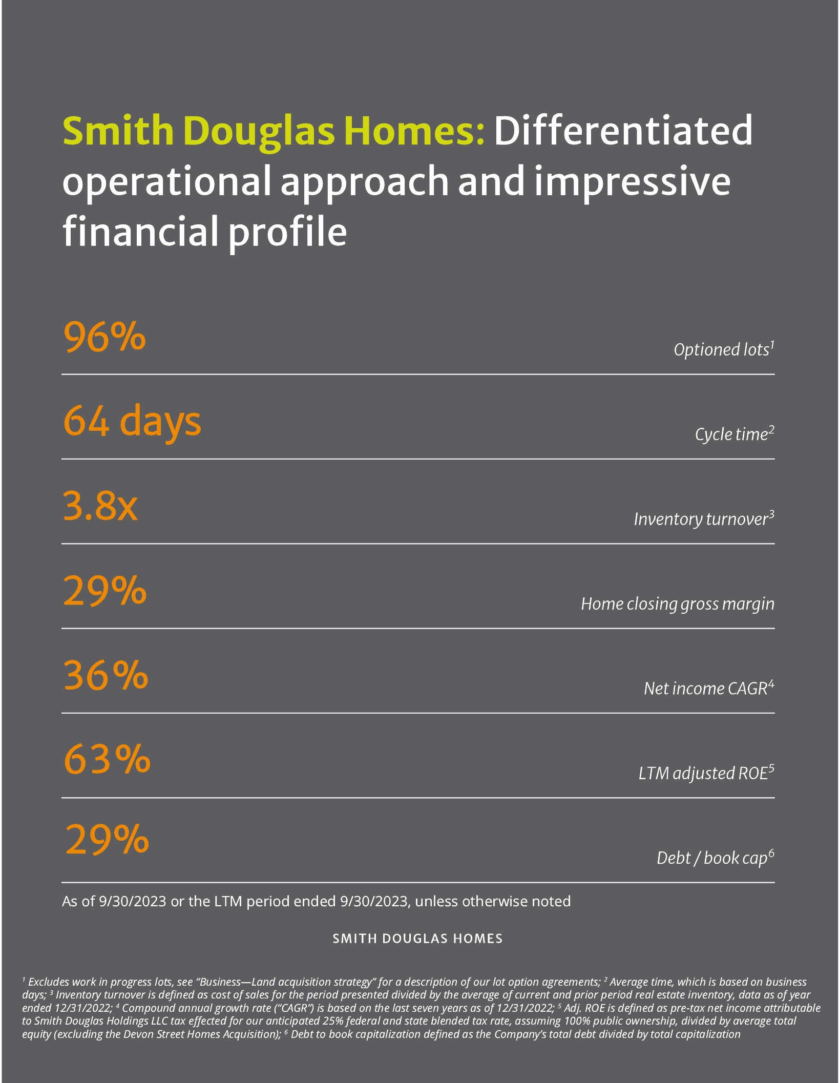 • | Smith Douglas Homes Corp. Other than the inception balance sheet, dated as of June 20, 2023 and the interim financial statements as of September 30, 2023, the historical financial information of Smith Douglas Homes Corp. has not been included in this prospectus as it is a newly incorporated entity, has had no business transactions or activities to date, besides our initial capitalization. |