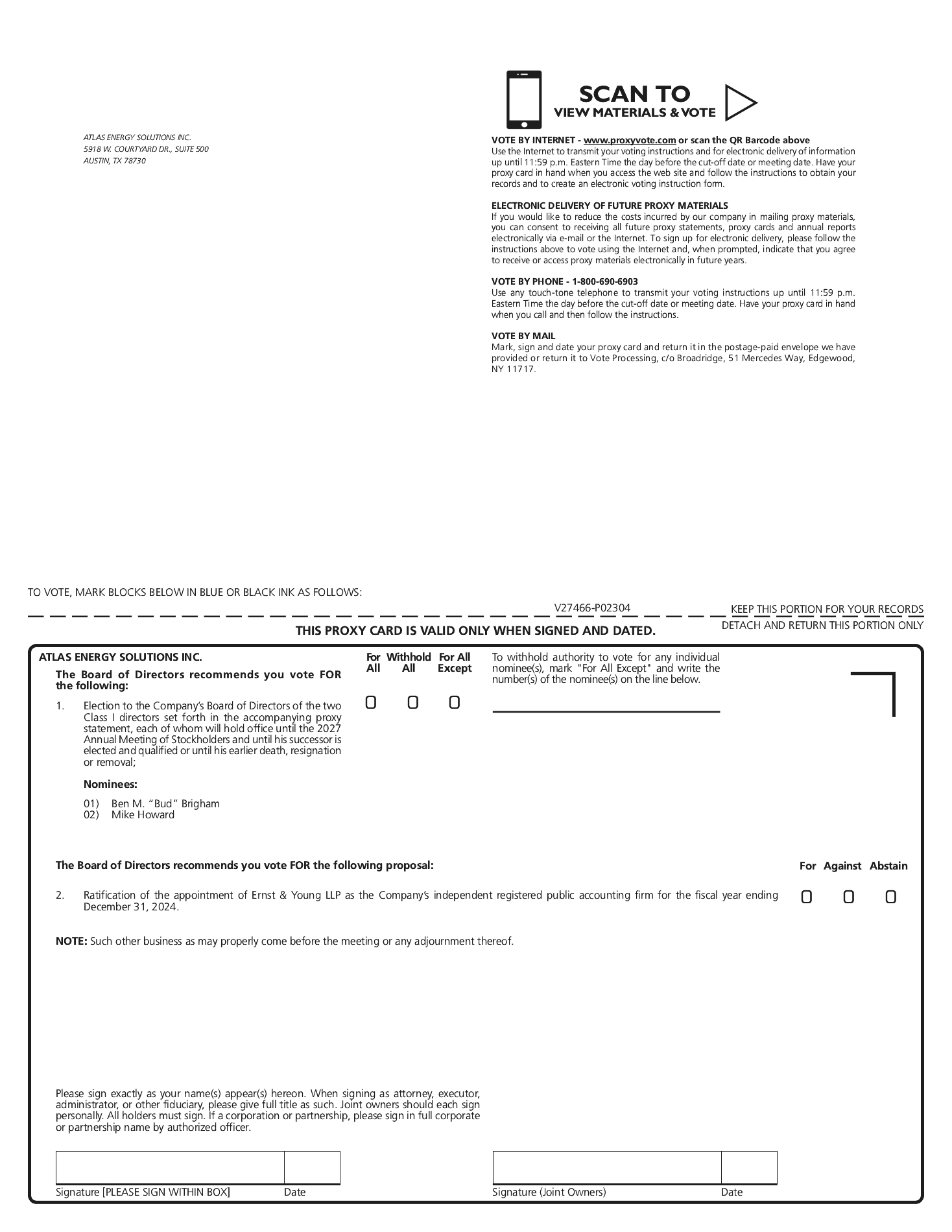 Notice is hereby given that the 2024 Annual Meeting of Stockholders (the “Annual Meeting”) of Atlas Energy Solutions Inc. (“Atlas” or the “Company”) will be held at the Company’s corporate headquarters at 5918 W. Courtyard Drive, Suite 500, Austin, Texas 78730, on May 9, 2024 at 10:00 a.m. Central Time. The Annual Meeting is being held for the following purposes: