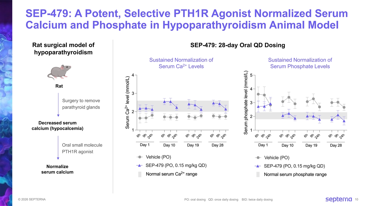 SEP-479: A Potent, Selective PTH1R Agonist Normalized Serum Calcium and Phosphate in Hypoparathyroidism Animal Model Rat surgical model of SEP-479: 28-day Oral QD Dosing hypoparathyroidism Sustained Normalization of Sustained Normalization of 2+ Serum Ca Levels Serum Phosphate Levels Rat Surgery to remove parathyroid glands Decreased serum calcium (hypocalcemia) Oral small molecule PTH1R agonist Normalize serum calcium © 2026 SEPTERNA PO: oral dosing QD: once daily dosing BID: twice daily dosing 10