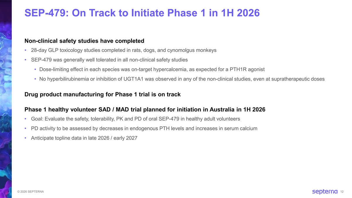 SEP-479: Preclinical Studies Demonstrated Favorable Oral Small Molecule Candidate Profile SEP-479: 7-day Healthy Cynomolgus Monkey Pharmacodynamic Study 2+ Serum PTH Levels Serum Ca Levels • Demonstrated robust dose-dependent decreases in endogenous PTH levels and increases in serum calcium • Lessons from PTH peptide therapies: doses that lead to ~0.5-1 mg/dL calcium increases in healthy volunteers translated into relevant therapeutic pharmacology in hypoparathyroidism patients SEP-479: Pharmacokinetics Studies (Mouse, Rat, Dog, Cyno) • Demonstrated high oral bioavailability and projected human half-life ~43-87 hours with potential to support QD human dosing © 2026 SEPTERNA 11