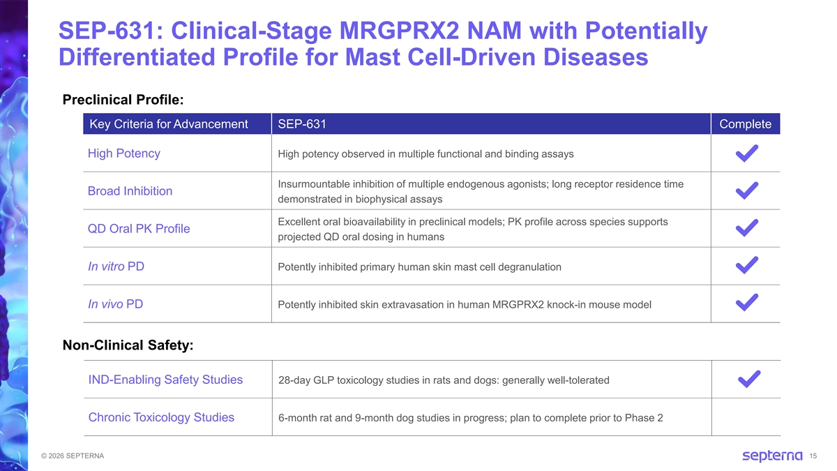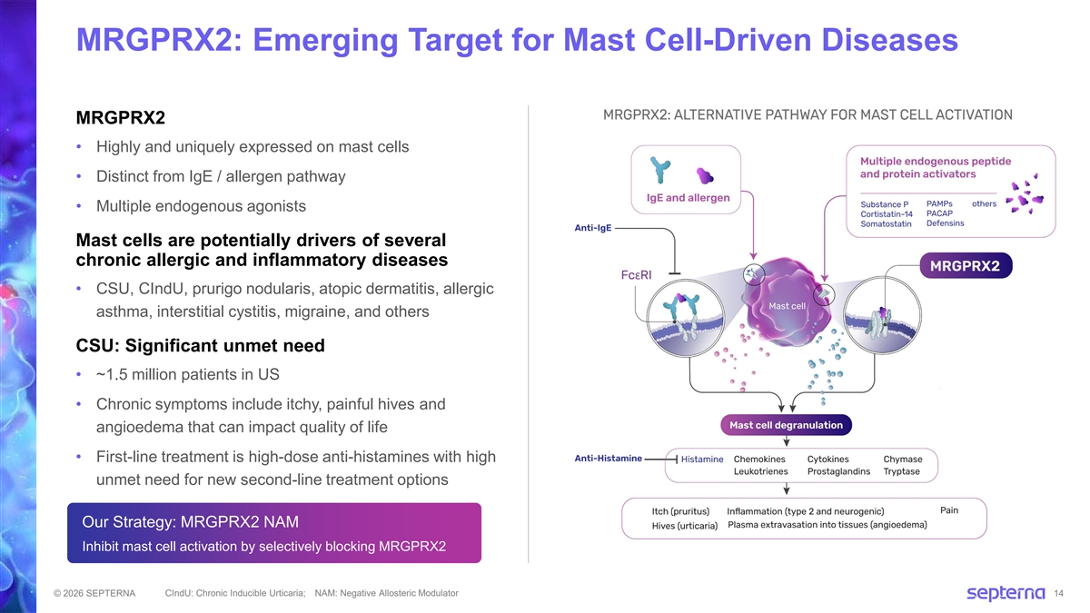 MRGPRX2: Emerging Target for Mast Cell-Driven Diseases MRGPRX2 • Highly and uniquely expressed on mast cells • Distinct from IgE / allergen pathway • Multiple endogenous agonists Mast cells are potentially drivers of several chronic allergic and inflammatory diseases • CSU, CIndU, prurigo nodularis, atopic dermatitis, allergic asthma, interstitial cystitis, migraine, and others CSU: Significant unmet need • ~1.5 million patients in US • Chronic symptoms include itchy, painful hives and angioedema that can impact quality of life • First-line treatment is high-dose anti-histamines with high unmet need for new second-line treatment options Our Strategy: MRGPRX2 NAM Inhibit mast cell activation by selectively blocking MRGPRX2 CIndU: Chronic Inducible Urticaria; NAM: Negative Allosteric Modulator © 2026 SEPTERNA 14