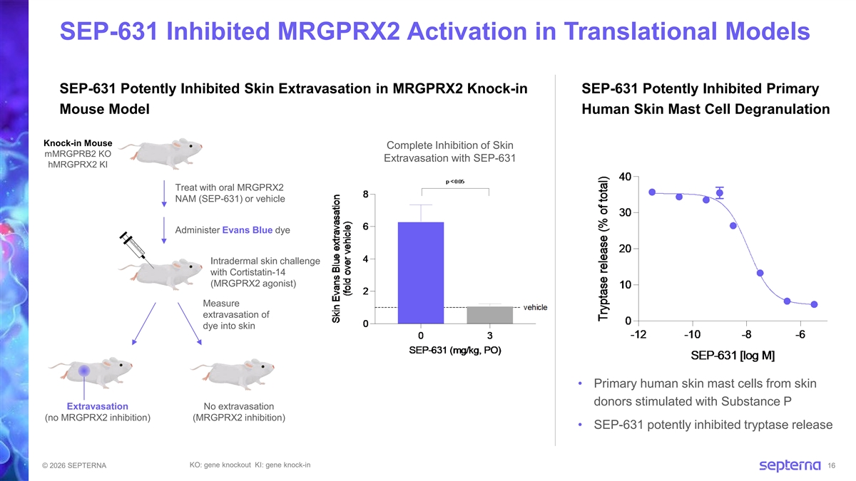 SEP-631: Clinical-Stage MRGPRX2 NAM with Potentially Differentiated Profile for Mast Cell-Driven Diseases Preclinical Profile: Key Criteria for Advancement SEP-631 Complete High Potency High potency observed in multiple functional and binding assays Insurmountable inhibition of multiple endogenous agonists; long receptor residence time Broad Inhibition demonstrated in biophysical assays Excellent oral bioavailability in preclinical models; PK profile across species supports QD Oral PK Profile projected QD oral dosing in humans In vitro PD Potently inhibited primary human skin mast cell degranulation In vivo PD Potently inhibited skin extravasation in human MRGPRX2 knock-in mouse model Non-Clinical Safety: IND-Enabling Safety Studies 28-day GLP toxicology studies in rats and dogs: generally well-tolerated Chronic Toxicology Studies 6-month rat and 9-month dog studies in progress; plan to complete prior to Phase 2 © 2026 SEPTERNA 15