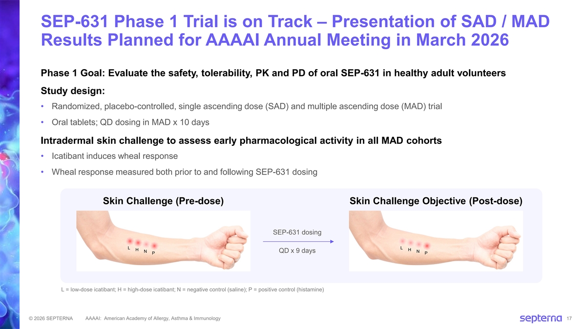SEP-631 Inhibited MRGPRX2 Activation in Translational Models SEP-631 Potently Inhibited Skin Extravasation in MRGPRX2 Knock-in SEP-631 Potently Inhibited Primary Mouse Model Human Skin Mast Cell Degranulation Knock-in Mouse Complete Inhibition of Skin mMRGPRB2 KO Extravasation with SEP-631 hMRGPRX2 KI Treat with oral MRGPRX2 NAM (SEP-631) or vehicle Administer Evans Blue dye Intradermal skin challenge with Cortistatin-14 (MRGPRX2 agonist) Measure extravasation of dye into skin • Primary human skin mast cells from skin donors stimulated with Substance P Extravasation No extravasation (no MRGPRX2 inhibition) (MRGPRX2 inhibition) • SEP-631 potently inhibited tryptase release KO: gene knockout KI: gene knock-in © 2026 SEPTERNA 16