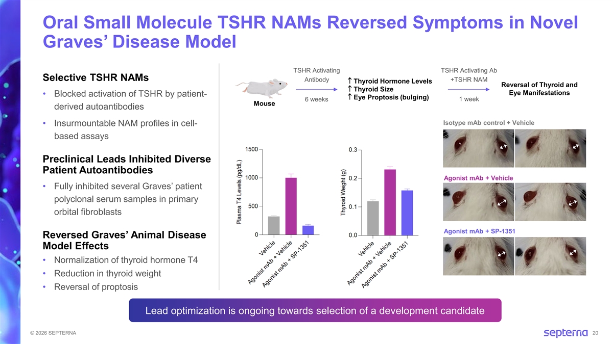 No Disease-Modifying Therapies for Graves’ Disease and Thyroid Eye Disease (TED) Graves’ Disease & TED Pathophysiology: • Autoantibodies activate TSHR in thyroid gland and in orbital fibroblasts behind the eyes Graves’ Disease • >2M patients in US • Standard-of-care: antithyroid drugs, radioactive iodine, thyroidectomy TED • Develops in ~50% of Graves’ disease patients • TEPEZZA® (anti-IGF-1R) decreases proptosis but requires multiple IV infusions; serious side effects (e.g., hearing loss) Challenge: Each Patient Has Unique Autoantibodies • High-affinity, frequently polyclonal, high titer Our Strategy: TSHR NAM as oral disease-modifying treatment for all Graves’ disease and TED patients © 2026 SEPTERNA 19