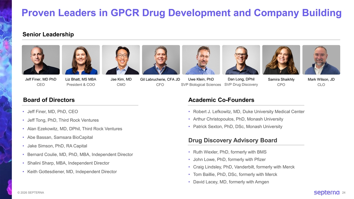 Proven Leaders in GPCR Drug Development and Company Building Senior Leadership Dan Long, DPhil Jeff Finer, MD PhD Liz Bhatt, MS MBA Jae Kim, MD Gil Labrucherie, CFA JD Uwe Klein, PhD Samira Shaikhly Mark Wilson, JD CEO President & COO CMO CFO SVP Biological Sciences SVP Drug Discovery CPO CLO Board of Directors Academic Co-Founders • Jeff Finer, MD, PhD, CEO • Robert J. Lefkowitz, MD, Duke University Medical Center • Arthur Christopoulos, PhD, Monash University • Jeff Tong, PhD, Third Rock Ventures • Patrick Sexton, PhD, DSc, Monash University • Alan Ezekowitz, MD, DPhil, Third Rock Ventures • Abe Bassan, Samsara BioCapital Drug Discovery Advisory Board • Jake Simson, PhD, RA Capital • Ruth Wexler, PhD, formerly with BMS • Bernard Coulie, MD, PhD, MBA, Independent Director • John Lowe, PhD, formerly with Pfizer • Shalini Sharp, MBA, Independent Director • Craig Lindsley, PhD, Vanderbilt, formerly with Merck • Keith Gottesdiener, MD, Independent Director • Tom Baillie, PhD, DSc, formerly with Merck • David Lacey, MD, formerly with Amgen © 2026 SEPTERNA 24