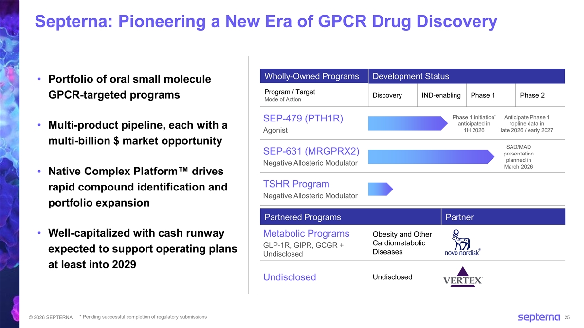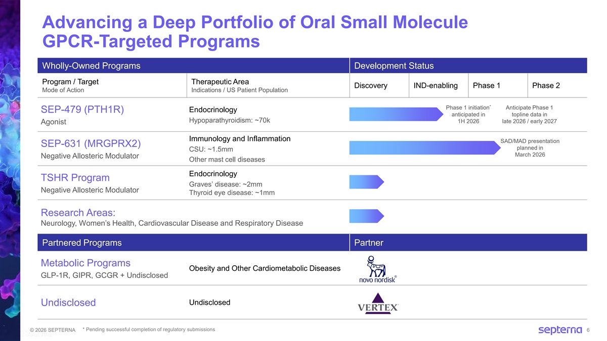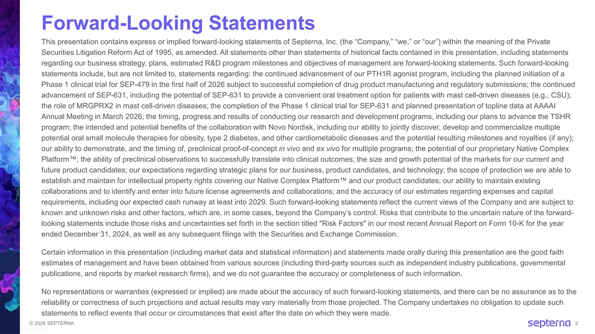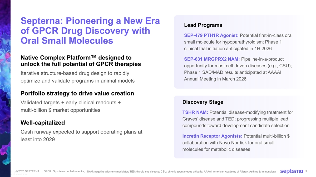 Forward-Looking Statements This presentation contains express or implied forward‐ looking statements of Septerna, Inc. (the “Company,” “we,” or “our”) within the meaning of the Private Securities Litigation Reform Act of 1995, as amended. All statements other than statements of historical facts contained in this presentation, including statements regarding our business strategy, plans, estimated R&D program milestones and objectives of management are forward-looking statements. Such forward-looking statements include, but are not limited to, statements regarding: the continued advancement of our PTH1R agonist program, including the planned initiation of a Phase 1 clinical trial for SEP-479 in the first half of 2026 subject to successful completion of drug product manufacturing and regulatory submissions; the continued advancement of SEP-631, including the potential of SEP-631 to provide a convenient oral treatment option for patients with mast cell-driven diseases (e.g., CSU); the role of MRGPRX2 in mast cell-driven diseases; the completion of the Phase 1 clinical trial for SEP-631 and planned presentation of topline data at AAAAI Annual Meeting in March 2026; the timing, progress and results of conducting our research and development programs, including our plans to advance the TSHR program; the intended and potential benefits of the collaboration with Novo Nordisk, including our ability to jointly discover, develop and commercialize multiple potential oral small molecule therapies for obesity, type 2 diabetes, and other cardiometabolic diseases and the potential resulting milestones and royalties (if any); our ability to demonstrate, and the timing of, preclinical proof-of-concept in vivo and ex vivo for multiple programs; the potential of our proprietary Native Complex Platform ; the ability of preclinical observations to successfully translate into clinical outcomes; the size and growth potential of the markets for our current and future product candidates; our expectations regarding strategic plans for our business, product candidates, and technology; the scope of protection we are able to establish and maintain for intellectual property rights covering our Native Complex Platform and our product candidates; our ability to maintain existing collaborations and to identify and enter into future license agreements and collaborations; and the accuracy of our estimates regarding expenses and capital requirements, including our expected cash runway at least into 2029. Such forward-looking statements reflect the current views of the Company and are subject to known and unknown risks and other factors, which are, in some cases, beyond the Company’s control. Risks that contribute to the uncertain nature of the forward- looking statements include those risks and uncertainties set forth in the section titled Risk Factors in our most recent Annual Report on Form 10-K for the year ended December 31, 2024, as well as any subsequent filings with the Securities and Exchange Commission. Certain information in this presentation (including market data and statistical information) and statements made orally during this presentation are the good faith estimates of management and have been obtained from various sources (including third-party sources such as independent industry publications, governmental publications, and reports by market research firms), and we do not guarantee the accuracy or completeness of such information. No representations or warranties (expressed or implied) are made about the accuracy of such forward-looking statements, and there can be no assurance as to the reliability or correctness of such projections and actual results may vary materially from those projected. The Company undertakes no obligation to update such statements to reflect events that occur or circumstances that exist after the date on which they were made. © 2026 SEPTERNA 2