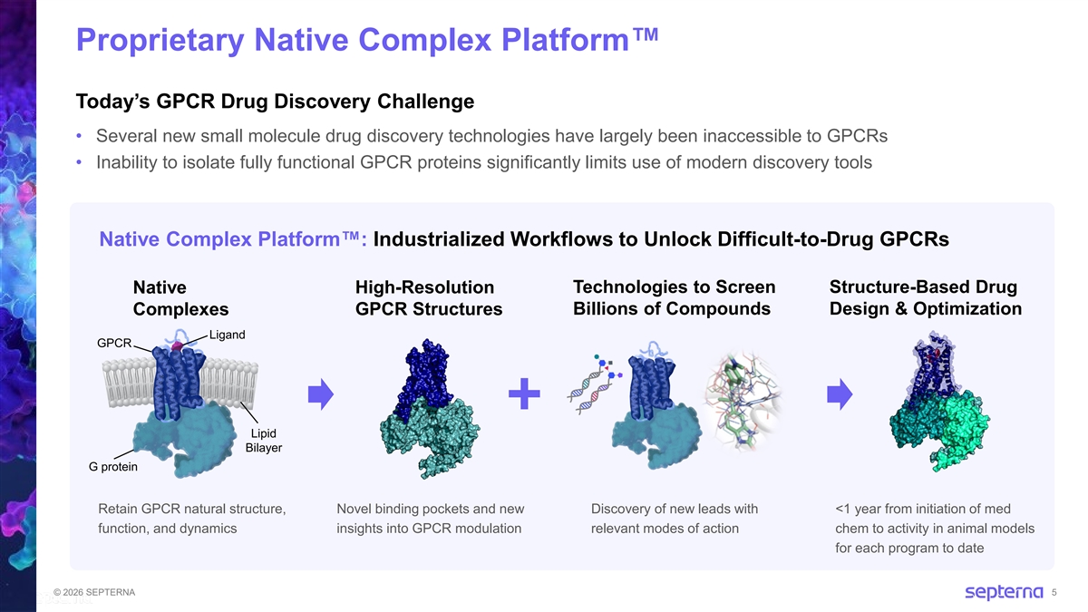 GPCR Drug Discovery Success Has Been Highly Concentrated to a Small Fraction of GPCRs Historically productive target class, yet substantial untapped opportunity to expand the number of druggable GPCRs ~1/3 of all FDA-approved drugs (~500 approved products) target GPCRs >70% of GPCR drugs target 6 small subfamilies of GPCRs ~75% of potential GPCR targets remain undrugged Our focus: Unlocking difficult-to-drug GPCRs with our Native Complex Platform © 2026 SEPTERNA 4