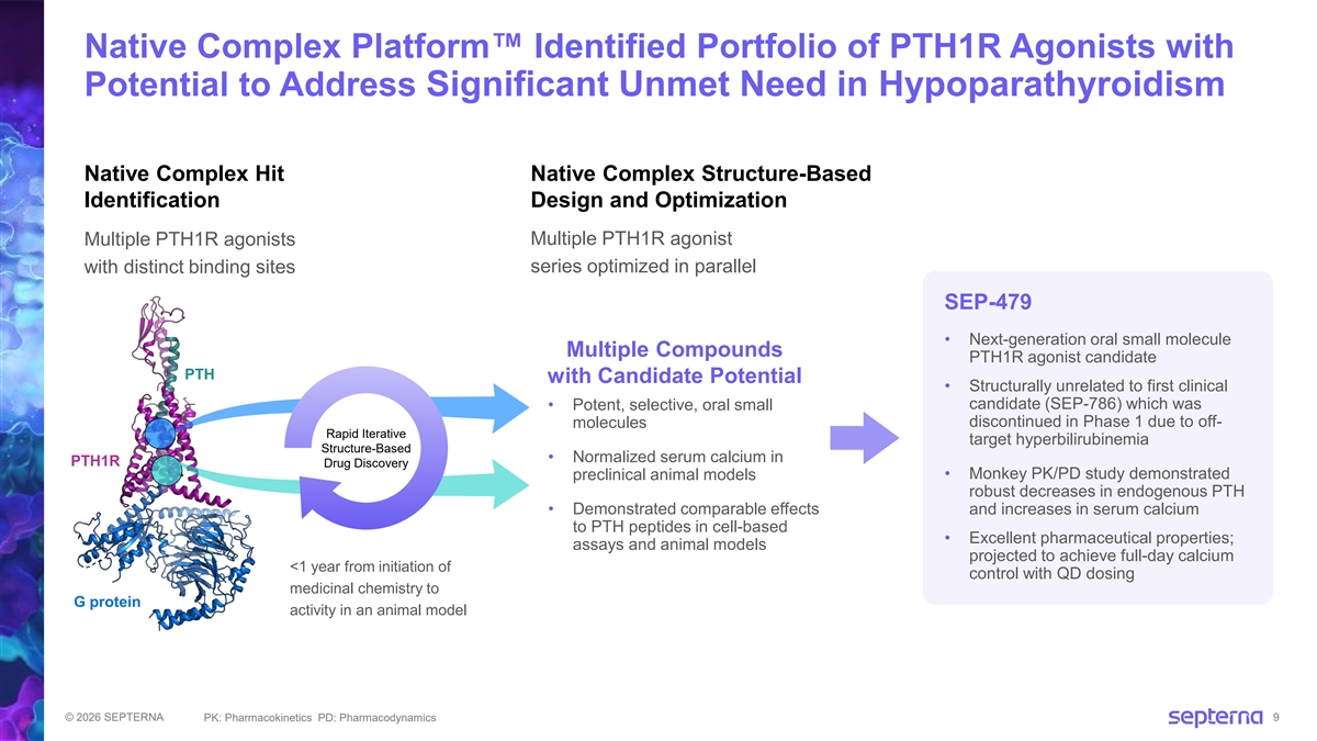 Hypoparathyroidism: Significant Unmet Need for an Oral PTH Replacement Hypoparathyroidism: Low PTH leads to low blood calcium PTH: Master Regulator of Blood Calcium • ~70K patients in US; ~140K patients in EU Challenging patient symptoms • Muscle cramps, tingling, brain fog • Life-threatening complications: cardiac arrhythmias, seizures Standard-of-care limitations • Calcium supplements (high doses several times per day) and Vitamin D do not fully resolve symptoms and lead to complications including calcifications and renal impairment • Approved injectable PTH therapy will require life-long daily injections Our Strategy: Functionally replace PTH with oral small molecule PTH1R agonist to normalize serum calcium © 2026 SEPTERNA 8 PTH: Parathyroid Hormone
