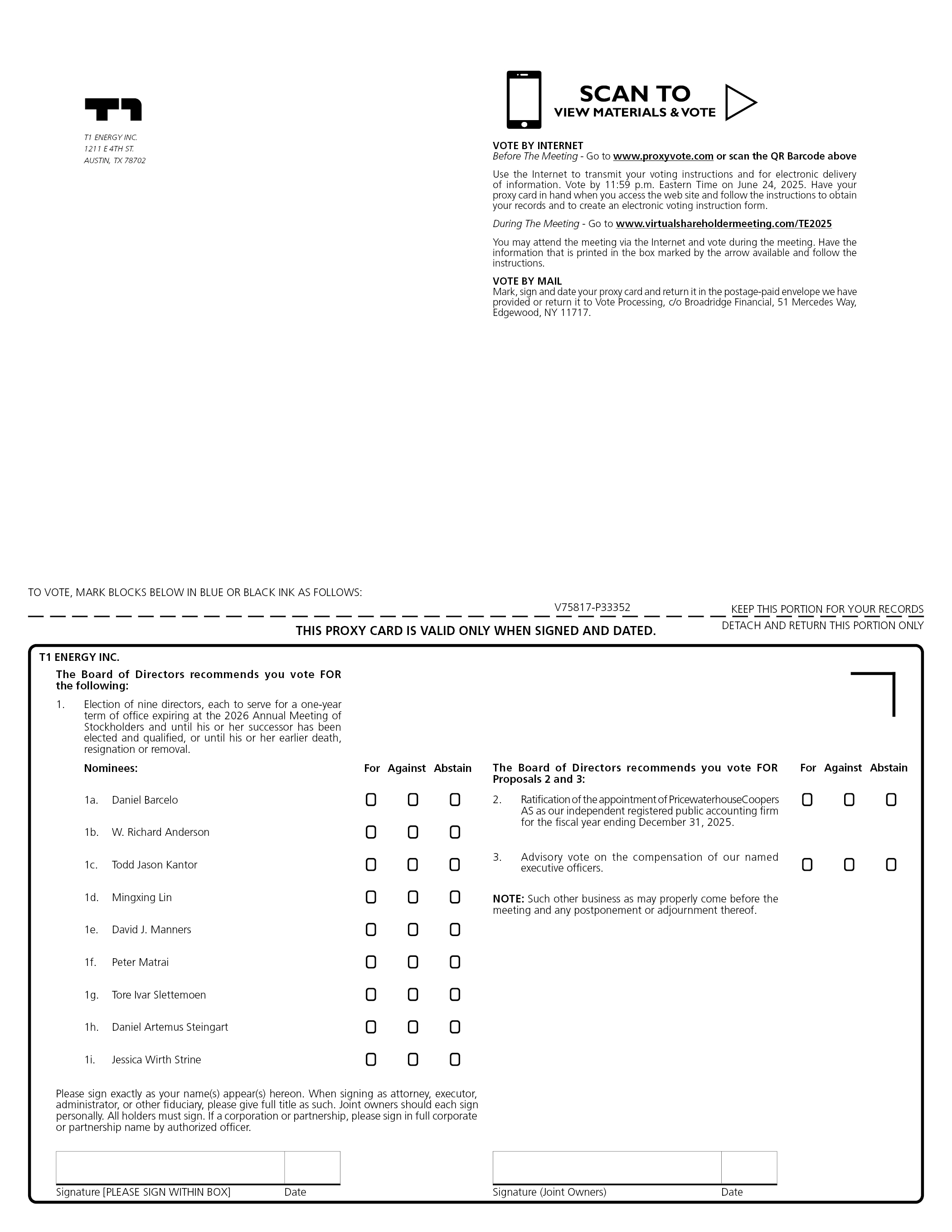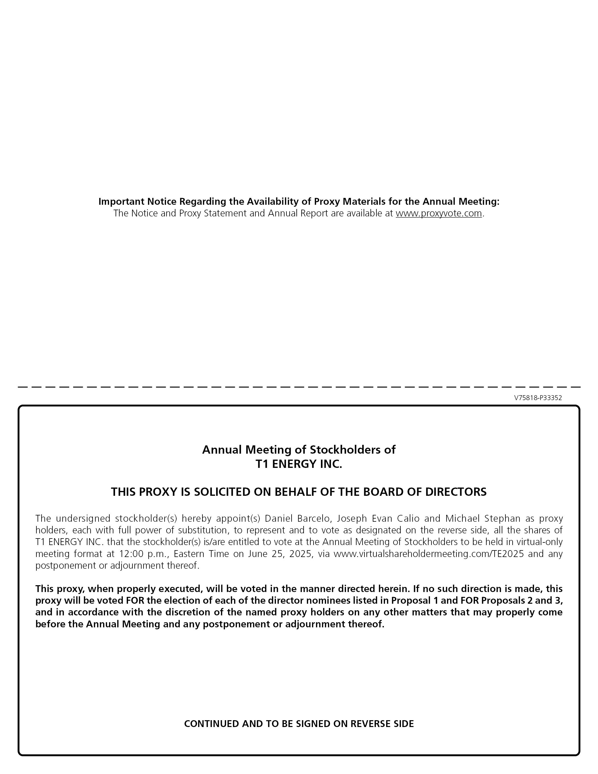 Important Notice Regarding the Availability of Proxy Materials for the Annual Meeting: The Notice and Proxy Statement and Annual Report are available at www.proxyvote.com. V75818-P33352 Annual Meeting of Stockholders of T1 ENERGY INC. THIS PROXY IS SOLICITED ON BEHALF OF THE BOARD OF DIRECTORS The undersigned stockholder(s) hereby appoint(s) Daniel Barcelo, Joseph Evan Calio and Michael Stephan as proxy holders, each with full power of substitution, to represent and to vote as designated on the reverse side, all the shares of T1 ENERGY INC. that the stockholder(s) is/are entitled to vote at the Annual Meeting of Stockholders to be held in virtual-only meeting format at 12:00 p.m., Eastern Time on June 25, 2025, via www.virtualshareholdermeeting.com/TE2025 and any postponement or adjournment thereof. This proxy, when properly executed, will be voted in the manner directed herein. If no such direction is made, this proxy will be voted FOR the election of each of the director nominees listed in Proposal 1 and FOR Proposals 2 and 3, and in accordance with the discretion of the named proxy holders on any other matters that may properly come before the Annual Meeting and any postponement or adjournment thereof. CONTINUED AND TO BE SIGNED ON REVERSE SIDE