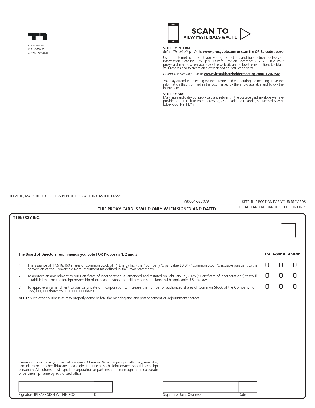 Signature [PLEASE SIGN WITHIN BOX] Date Signature (Joint Owners) Date TO VOTE, MARK BLOCKS BELOW IN BLUE OR BLACK INK AS FOLLOWS: KEEP THIS PORTION FOR YOUR RECORDS DETACH AND RETURN THIS PORTION ONLY THIS PROXY CARD IS VALID ONLY WHEN SIGNED AND DATED. V80564 - S23079 For Against Abstain T1 ENERGY INC. 1211 E 4TH ST. AUSTIN, TX 78702 VOTE BY INTERNET Before The Meeting - Go to www.proxyvote.com or scan the QR Barcode above Use the Internet to transmit your voting instructions and for electronic delivery of information . Vote by 11 : 59 p . m . Eastern Time on December 2 , 2025 . Have your proxy card in hand when you access the web site and follow the instructions to obtain your records and to create an electronic voting instruction form . During The Meeting - Go to www.virtualshareholdermeeting.com/TE2025SM You may attend the meeting via the Internet and vote during the meeting . Have the information that is printed in the box marked by the arrow available and follow the instructions . VOTE BY MAIL Mark, sign and date your proxy card and return it in the postage - paid envelope we have provided or return it to Vote Processing, c/o Broadridge Financial, 51 Mercedes Way, Edgewood, NY 11717 . T1 ENERGY INC. Please sign exactly as your name(s) appear(s) hereon . When signing as attorney, executor, administrator, or other fiduciary, please give full title as such . Joint owners should each sign personally . All holders must sign . If a corporation or partnership, please sign in full corporate or partnership name by authorized officer . 1. The issuance of 17,918,460 shares of Common Stock of T1 Energy Inc. (the “Company”), par value $0.01 (“Common Stock”), issuable pursuant to the conversion of the Convertible Note Instrument (as defined in the Proxy Statement) 2. To approve an amendment to our Certificate of Incorporation, as amended and restated on February 19, 2025 (“Certificate of Incorporation”) that will establish limits on the foreign ownership of our capital stock to facilitate our compliance with applicable U.S. tax laws The Board of Directors recommends you vote FOR Proposals 1, 2 and 3: NOTE: Such other business as may properly come before the meeting and any postponement or adjournment thereof. O O O O O O 3. To approve an amendment to our Certificate of Incorporation to increase the number of authorized shares of Common Stock of the Company from O O O 355,000,000 shares to 500,000,000 shares SCAN TO VIEW MATERIALS & VOTE ڀ