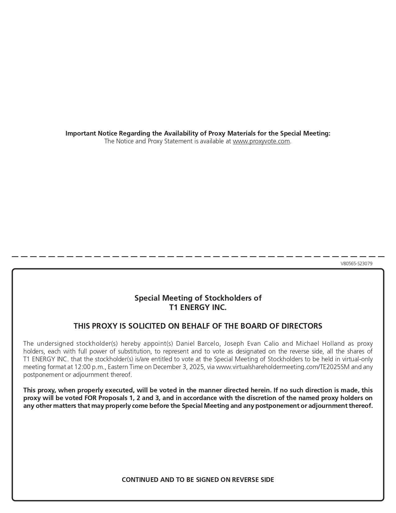 Important Notice Regarding the Availability of Proxy Materials for the Special Meeting: The Notice and Proxy Statement is available at www.proxyvote.com . V80565 - S23079 Special Meeting of Stockholders of T1 ENERGY INC. THIS PROXY IS SOLICITED ON BEHALF OF THE BOARD OF DIRECTORS The undersigned stockholder(s) hereby appoint(s) Daniel Barcelo, Joseph Evan Calio and Michael Holland as proxy holders, each with full power of substitution, to represent and to vote as designated on the reverse side, all the shares of T 1 ENERGY INC . that the stockholder(s) is/are entitled to vote at the Special Meeting of Stockholders to be held in virtual - only meeting format at 12 : 00 p . m . , Eastern Time on December 3 , 2025 , via www . virtualshareholdermeeting . com/TE 2025 SM and any postponement or adjournment thereof . This proxy, when properly executed, will be voted in the manner directed herein . If no such direction is made, this proxy will be voted FOR Proposals 1 , 2 and 3 , and in accordance with the discretion of the named proxy holders on any other matters that may properly come before the Special Meeting and any postponement or adjournment thereof . CONTINUED AND TO BE SIGNED ON REVERSE SIDE
