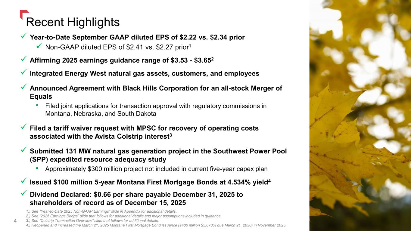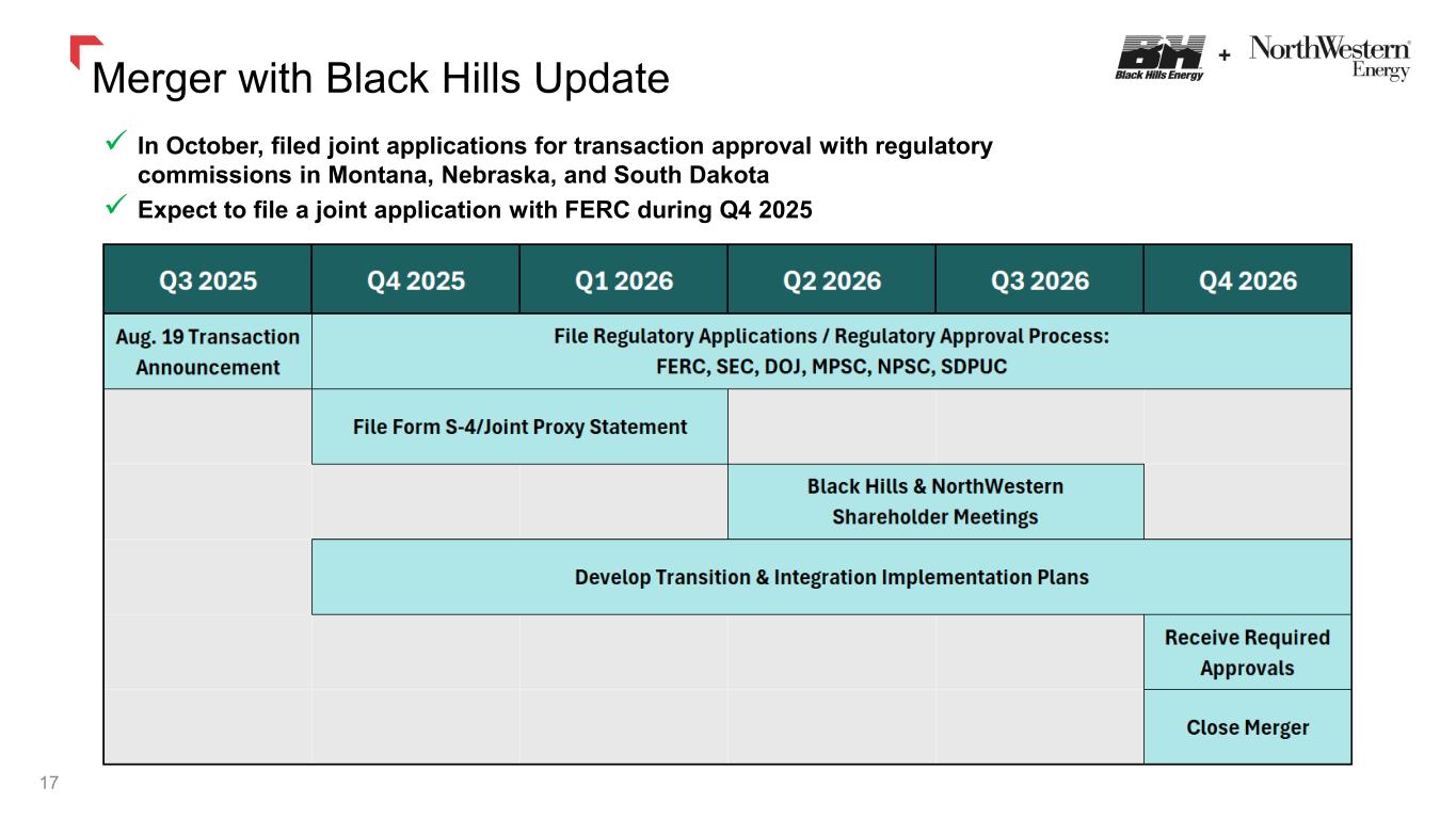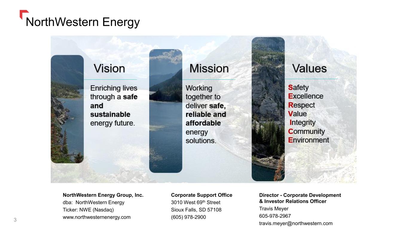 Forward-Looking Statements 2 Information in this communication, other than statements of historical facts, may constitute forward-looking statements, within the meaning of Section 27A of the Securities Act of 1933, as amended, and Section 21E of the Securities Exchange Act of 1934, as amended. These statements include, but are not limited to, statements about the benefits of the proposed transaction between NorthWestern and Black Hills, including future financial and operating results (including the anticipated impact of the transaction on NorthWestern’s and Black Hills’ respective earnings), statements related to the expected timing of the completion of the transaction, the plans, objectives, expectations and intentions of either company or of the combined company following the merger, anticipated future results of either company or of the combined company following the merger, the anticipated benefits and strategic and financial rationale of the merger, including estimated rate bases, investment opportunities, cash flows and capital expenditure rates and other statements that are not historical facts. Forward-looking statements may be identified by terminology such as “may,” “will,” “should,” “targets,” “scheduled,” “plans,” “intends,” “goal,” “anticipates,” “expects,” “believes,” “forecasts,” “outlook,” “estimates,” “potential,” or “continue” or negatives of such terms or other comparable terminology. The forward-looking statements are based on NorthWestern and Black Hills’ current expectations, plans and estimates. NorthWestern and Black Hills believe these assumptions to be reasonable, but there is no assurance that they will prove to be accurate. All forward-looking statements are subject to risks, uncertainties and other factors that may cause the actual results, performance or achievements of NorthWestern or Black Hills to differ materially from any results expressed or implied by such forward-looking statements. Such factors include, among others, (1) the risk of delays in consummating the potential transaction, including as a result of required regulatory and shareholder approvals, which may not be obtained on the expected timeline, or at all, (2) the risk of any event, change or other circumstance that could give rise to the termination of the merger agreement, (3) the risk that required regulatory approvals are subject to conditions not anticipated by NorthWestern and Black Hills, (4) the possibility that any of the anticipated benefits and projected synergies of the potential transaction will not be realized or will not be realized within the expected time period, (5) disruption to the parties’ businesses as a result of the announcement and pendency of the transaction, including potential distraction of management from current plans and operations of NorthWestern or Black Hills and the ability of NorthWestern or Black Hills to retain and hire key personnel, (6) reputational risk and the reaction of each company’s customers, suppliers, employees or other business partners to the transaction, (7) the possibility that the transaction may be more expensive to complete than anticipated, including as a result of unexpected factors or events, (8) the outcome of any legal or regulatory proceedings that may be instituted against NorthWestern or Black Hills related to the merger agreement or the transaction, (9) the risks associated with third party contracts containing consent and/or other provisions that may be triggered by the proposed transaction, (10) legislative, regulatory, political, market, economic and other conditions, developments and uncertainties affecting NorthWestern’s and Black Hills’ businesses; (11) the evolving legal, regulatory and tax regimes under which NorthWestern and Black Hills operate; (12) restrictions during the pendency of the proposed transaction that may impact NorthWestern’s or Black Hills’ ability to pursue certain business opportunities or strategic transactions; and (13) unpredictability and severity of catastrophic events, including, but not limited to, extreme weather, natural disasters, acts of terrorism or outbreak of war or hostilities, as well as NorthWestern’s and Black Hills’ response to any of the aforementioned factors. Additional factors which could affect future results of NorthWestern and Black Hills can be found in NorthWestern Energy’s Annual Report on Form 10-K, Quarterly Reports on Form 10-Q, and Current Reports on Form 8-K, and Black Hills’ Annual Report on Form 10-K, Quarterly Reports on Form 10-Q, and Current Reports on Form 8-K, in each case filed with the SEC and available on the SEC’s website at http://www.sec.gov. NorthWestern and Black Hills disclaim any obligation and do not intend to update or revise any forward-looking statements contained in this communication, which speak only as of the date hereof, whether as a result of new information, future events or otherwise, except as required by federal securities laws. See Appendix for Additional Merger Related Disclosures.