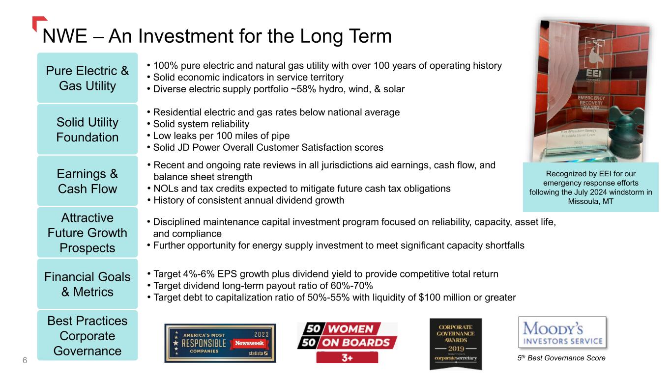 Best Practices Governance 15 America’s Most Responsible Companies Recognized by Newsweek as one of the most responsible companies in 2023. One of only eleven EEI member utilities selected. Board of Directors Executive Team 5th Best Score Among 50 Publicly Traded North American Utility and Power Companies by Moody’s Investment Services for Best Governance Practices Diverse Leadership 2024 CEO Pay Ratio to Median Employee Salary NWE 34:1 U.S. Utilities 13 Member Peer Average in ‘24 Group Average in ‘24 72:1 43:1 CEO Pay to Peers 88% Recent Governance Recognition Great Place To Work Certified Recognized by Great Place To Work as one of the world’s greatest workplaces in 2025. 50 / 50 – Women on Boards Recognized for gender diversity on its board of directors by 2022 Women on Boards. Currently four of the company’s nine directors are female. Edison Electric Institute Emergency Response Award recipient Recognized in 2023 and 2025 for swift restoration efforts following a derecho in South Dakota (May 2022), historic flooding in Yellowstone National Park (June 2022), and a hurricane-force windstorm in Missoula, MT (July 2024). These awards highlight the company’s commitment to reliability, resilience, and customer service in the face of extreme weather challenges. CEO Pay Source: S&P Capital IQ Pro and AFLCIO.org