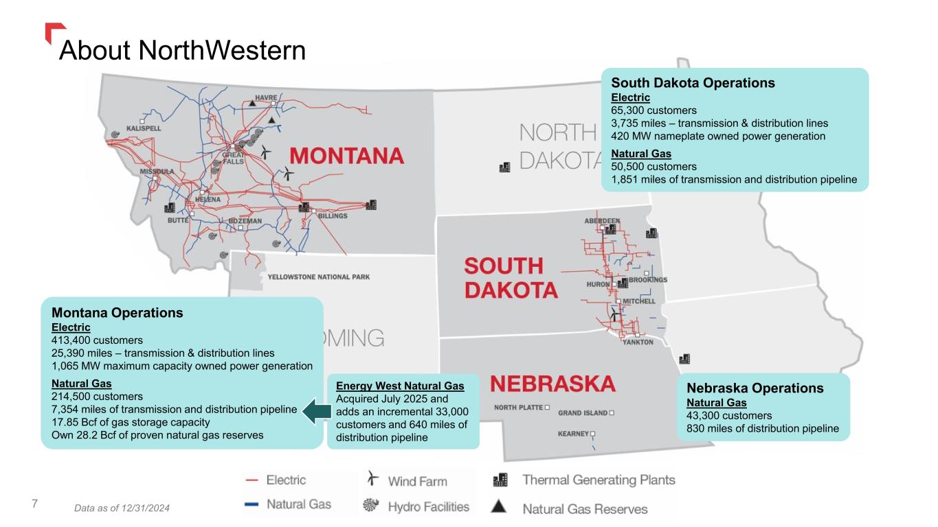 NWE – An Investment for the Long Term 6 • Recent and ongoing rate reviews in all jurisdictions aid earnings, cash flow, and balance sheet strength • NOLs and tax credits expected to mitigate future cash tax obligations • History of consistent annual dividend growth • 100% pure electric and natural gas utility with over 100 years of operating history • Solid economic indicators in service territory • Diverse electric supply portfolio ~58% hydro, wind, & solar Pure Electric & Gas Utility Solid Utility Foundation Earnings & Cash Flow Attractive Future Growth Prospects Financial Goals & Metrics Best Practices Corporate Governance • Residential electric and gas rates below national average • Solid system reliability • Low leaks per 100 miles of pipe • Solid JD Power Overall Customer Satisfaction scores • Disciplined maintenance capital investment program focused on reliability, capacity, asset life, and compliance • Further opportunity for energy supply investment to meet significant capacity shortfalls • Target 4%-6% EPS growth plus dividend yield to provide competitive total return • Target dividend long-term payout ratio of 60%-70% • Target debt to capitalization ratio of 50%-55% with liquidity of $100 million or greater 5th Best Governance Score Recognized by EEI for our emergency response efforts following the July 2024 windstorm in Missoula, MT