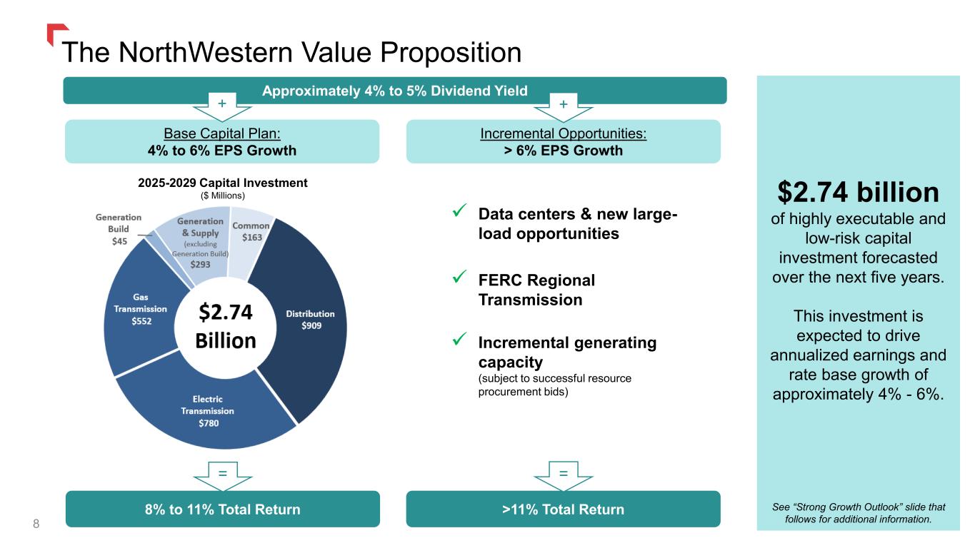 About NorthWestern 7 Montana Operations Electric 413,400 customers 25,390 miles – transmission & distribution lines 1,065 MW maximum capacity owned power generation Natural Gas 214,500 customers 7,354 miles of transmission and distribution pipeline 17.85 Bcf of gas storage capacity Own 28.2 Bcf of proven natural gas reserves Nebraska Operations Natural Gas 43,300 customers 830 miles of distribution pipeline Data as of 12/31/2024 South Dakota Operations Electric 65,300 customers 3,735 miles – transmission & distribution lines 420 MW nameplate owned power generation Natural Gas 50,500 customers 1,851 miles of transmission and distribution pipeline Energy West Natural Gas Acquired July 2025 and adds an incremental 33,000 customers and 640 miles of distribution pipeline
