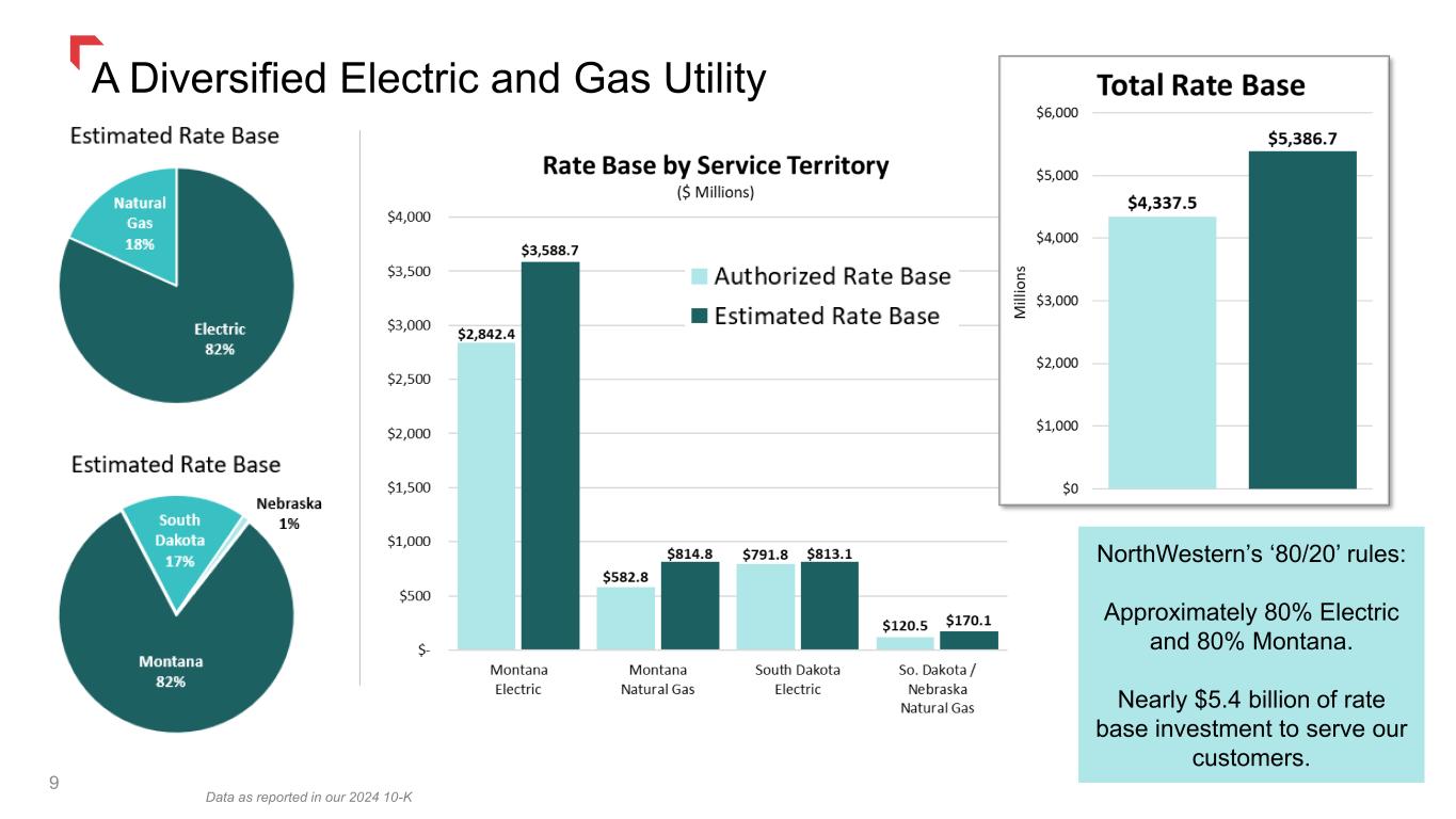 8% to 11% Total Return >11% Total Return Incremental Opportunities: > 6% EPS Growth Approximately 4% to 5% Dividend Yield Base Capital Plan: 4% to 6% EPS Growth ✓ Data centers & new large- load opportunities ✓ FERC Regional Transmission ✓ Incremental generating capacity (subject to successful resource procurement bids) $2.74 billion of highly executable and low-risk capital investment forecasted over the next five years. This investment is expected to drive annualized earnings and rate base growth of approximately 4% - 6%. See “Strong Growth Outlook” slide that follows for additional information. + The NorthWestern Value Proposition + 8 = = 2025-2029 Capital Investment ($ Millions)
